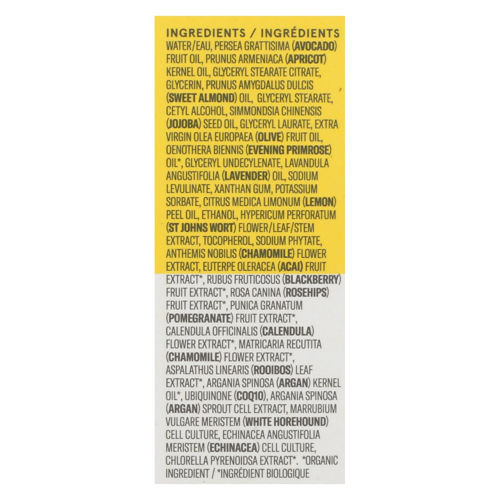 ingredients : water;aqua;persea gratissima;avocado;oil;prunus armeniaca;apricot;kernel oil;glyceryl stearate citrate;glycerin;cetyl alcohol;glyceryl stearate;prunus amygdalus dulcis;sweet almond;glyceryl laurate;simmondsia chinensis;jojoba;seed extract;glyceryl undecylenate;oenothera biennis;evening primrose;lavandula angustifolia;lavender;xanthan gum;olea europaea;olive;fruit oil;sodium levulinate;potassium sorbate;citrus medica limonum;lemon;peel oil;citric acid;sodium phytate;tocopherol;euterpe oleracea;ac