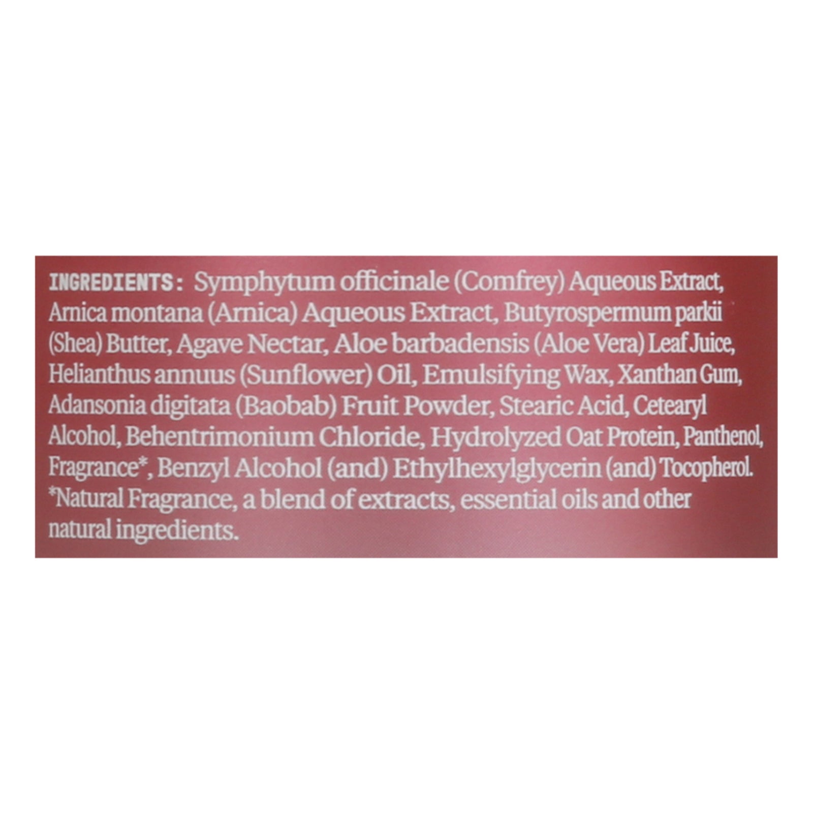 ingredients : symphytum officinale (comfrey) aqueous extract;arnica montana (arnica) aqueous extract;butyrospermum parkii (shea) butter;agave nectar;aloe barbadensis (aloe vera) leaf juice;helianthus annuus (sunflower) oil;emulsifying wax;xanthan gum;adansonia digitata (baobab) fruit powder;stearic acid;cetearyl alcohol;behentrimonium chloride;hydrolyzed oat protein;panthenol;fragrance;benzyl alcohol (and) ethylhexylglycerin (and) tocopherol