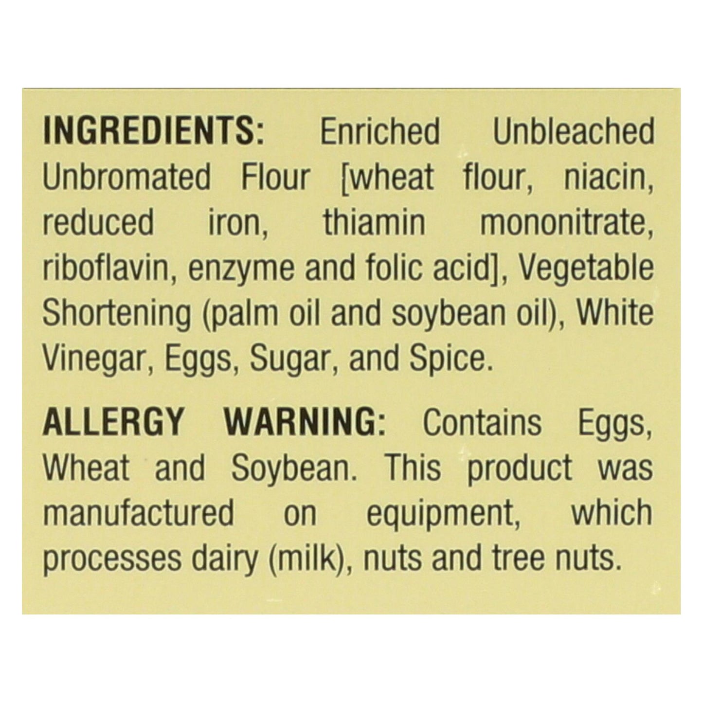 ingredients : enriched unbleached unbromated flour [wheat flour;niacin;reduced iron;thiamin mononitrate;riboflavin;enzyme and folic acid];vegetable shortening;palm oil and soybean oil;white vinegar;eggs;sugar;and spice