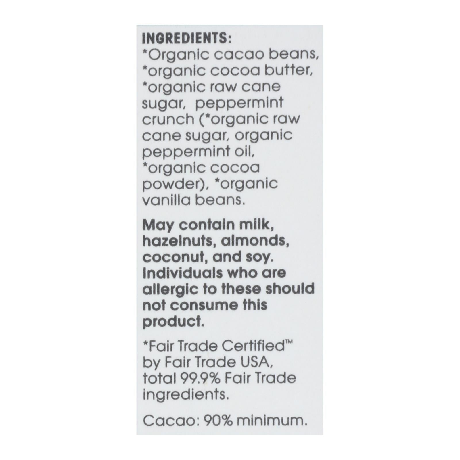 ingredients : organic cacao beans;organic cocoa butter;organic raw cane sugar;peppermint crunch (*organic raw cane sugar, organic peppermint oil, *organic cocoa powder);organic vanilla beans