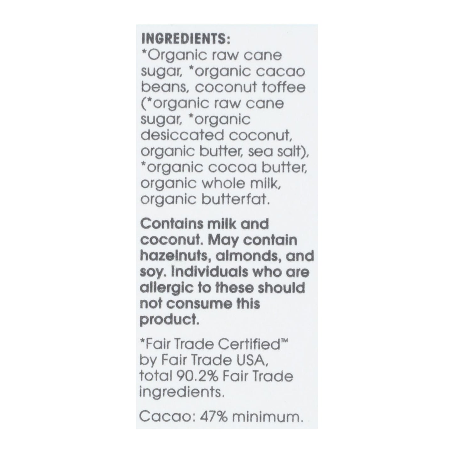 ingredients : organic raw cane sugar;organic cacao beans;coconut toffee (*organic raw cane sugar, *organic desiccated coconut, organic butter, sea salt);organic cocoa butter;organic whole milk;organic butterfat