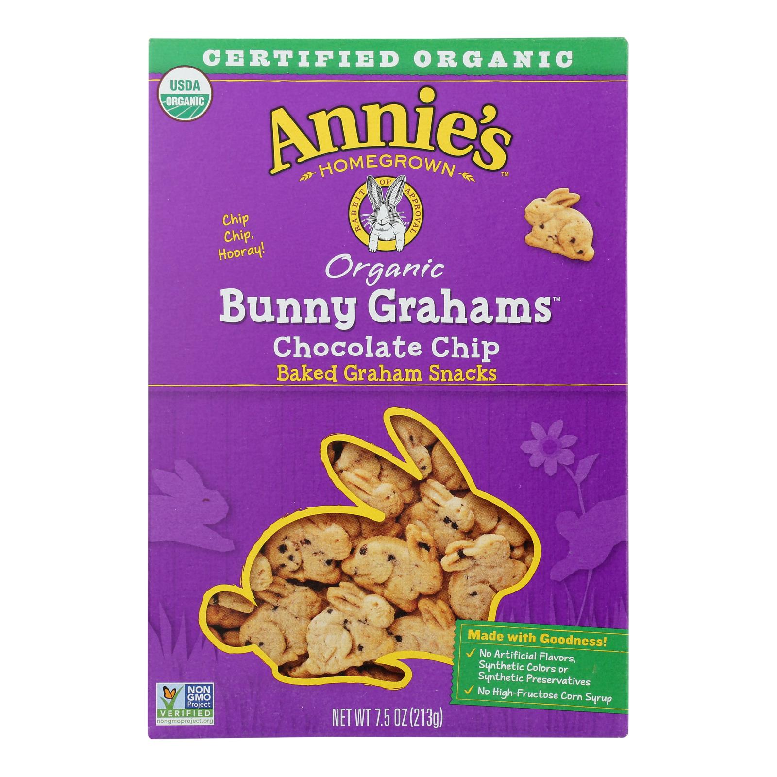 Annie's homegrown organic bunny grahams in chocolate chip flavor are a delicious baked snack made with the goodness of whole grains. We partner with people and places we trust to grow the non-gmo project verified ingredients that make up our wholesome graham snacks. We include no artificial flavors, artificial colors or artificial preservatives. Each serving is only 130 calories and contains no high fructose corn syrup. Includes one 7.5 oz. Box of annie's homegrown organic bunny grahams in chocolate chip flavor. See nutrition facts panel for allergens.