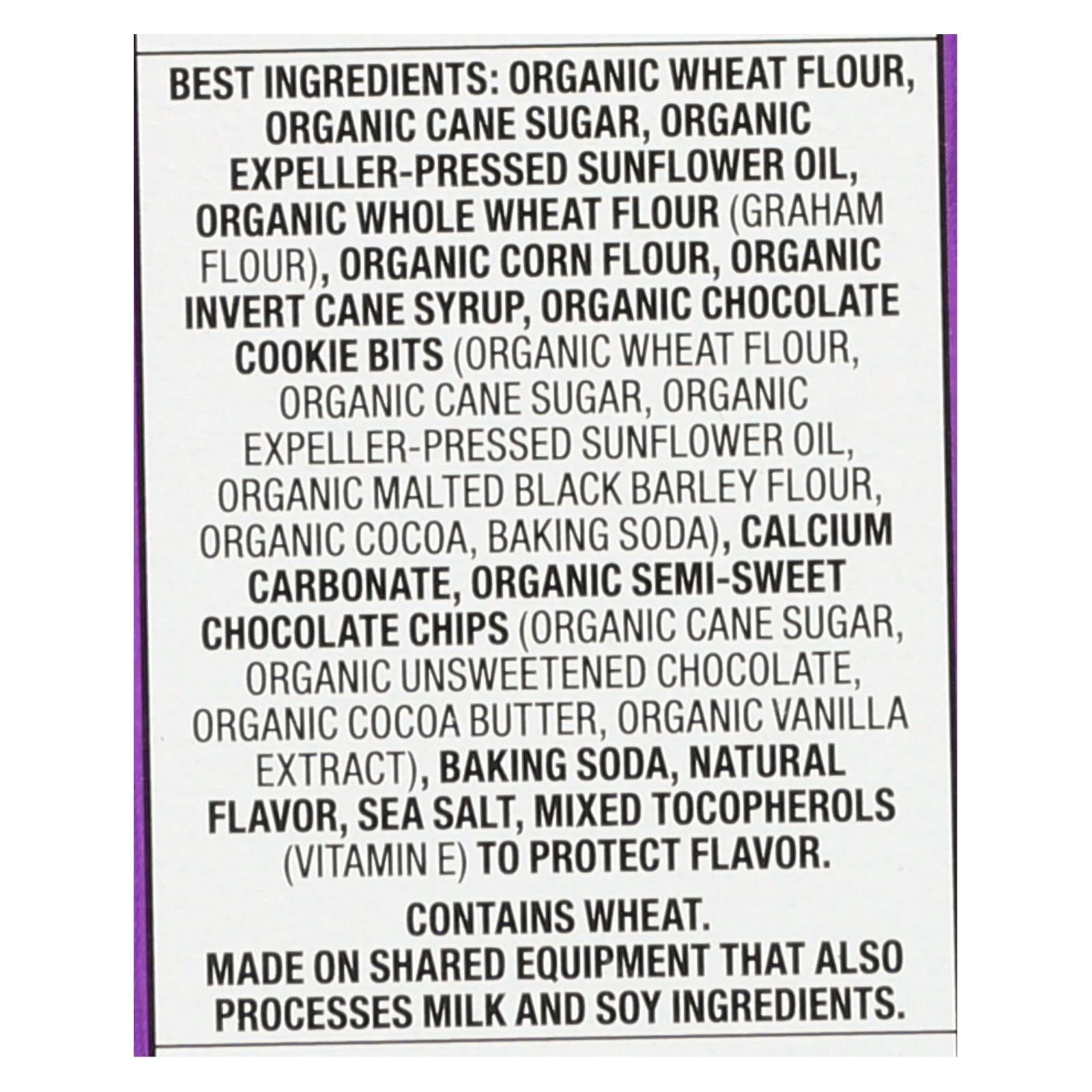 ingredients : organic wheat flour;organic cane sugar;organic expeller-pressed sunflower oil;organic corn flour;organic whole wheat flour;graham flour;organic invert cane syrup;organic chocolate cookie bits;organic sugar;organic malted black barley flour;organic cocoa;baking soda;calcium carbonate;organic semi-sweet chocolate chips;organic unsweetened chocolate;organic cocoa butter;organic vanilla extract;sea salt;natural flavor;mixed tocopherols;vitamin e;to protect flavor