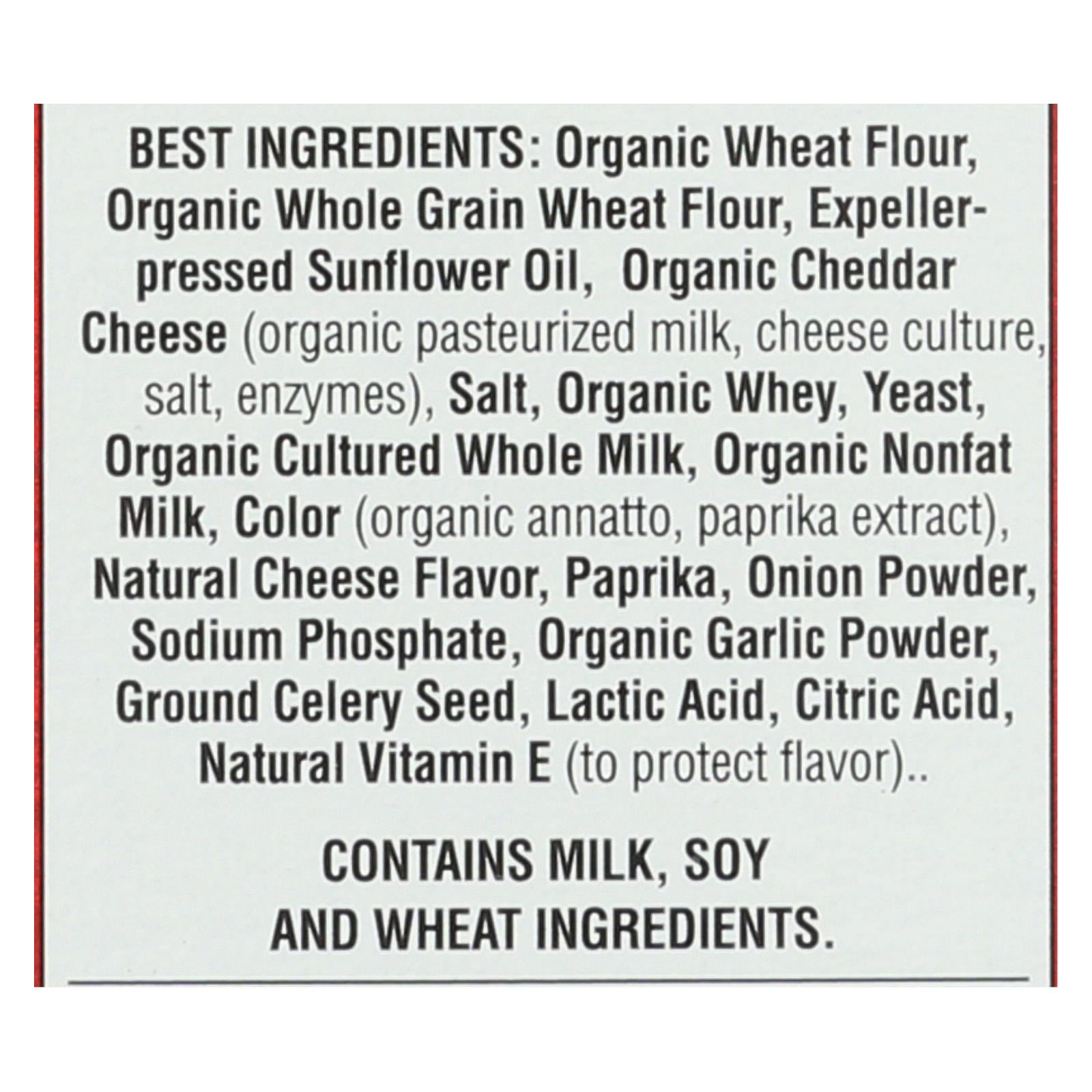 ingredients : best organic wheat flour;organic whole grain wheat flour;expeller-pressed sunflower oil;organic cheddar cheese (organic pasteurized milk, cheese culture, salt, enzymes);salt;organic whey;yeast;organic cultured whole milk;organic nonfat milk;color (organic annatto, paprika extract);natural cheese flavor;paprika;onion powder;sodium phosphate;organic garlic powder;ground celery seed;lactic acid;citric acid;natural vitamin e (to protect flavor)