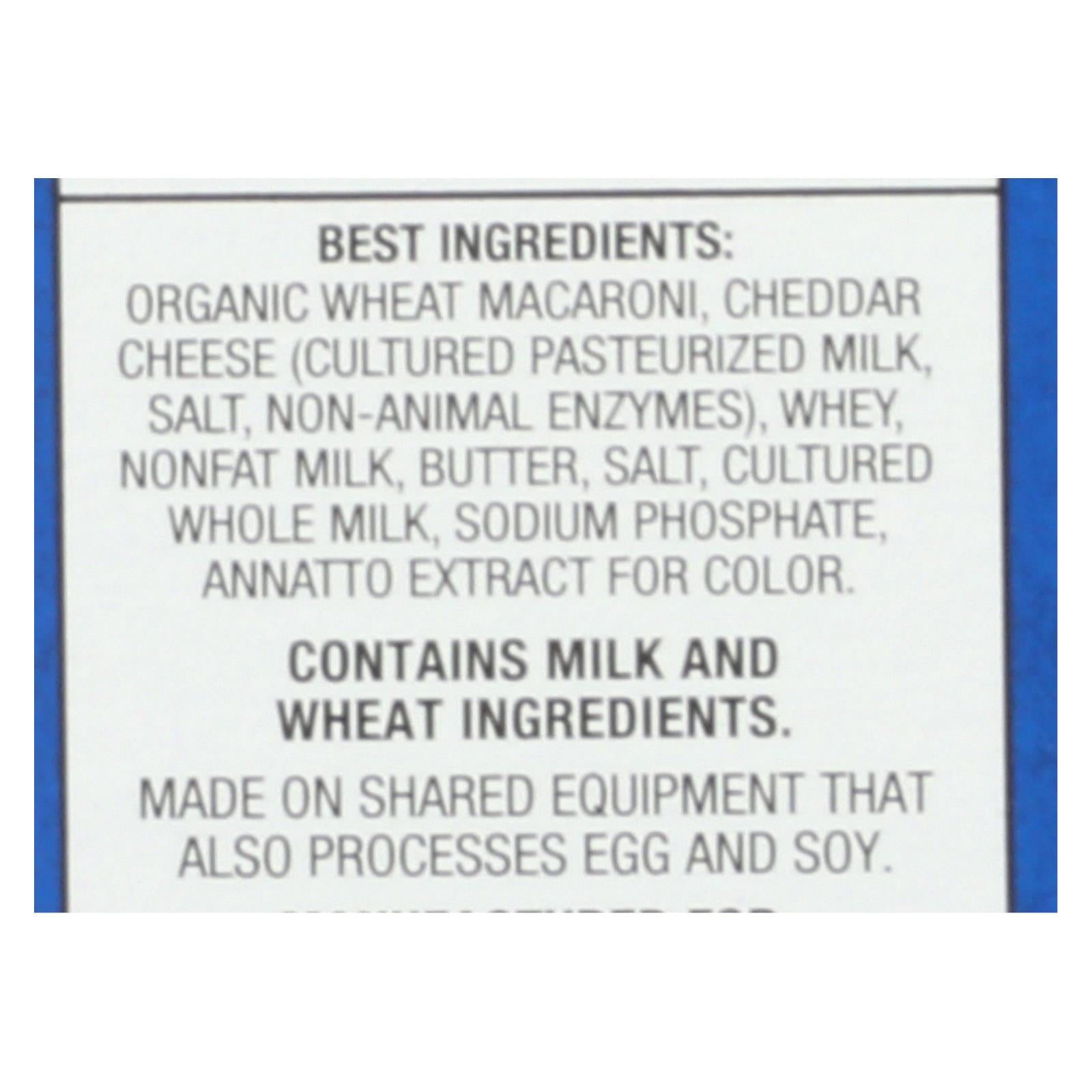 ingredients : best : organic wheat macaroni;cheddar cheese;cultured pasteurized milk;salt;non-animal enzymes;whey;nonfat milk;sodium phosphate;annatto extract for color