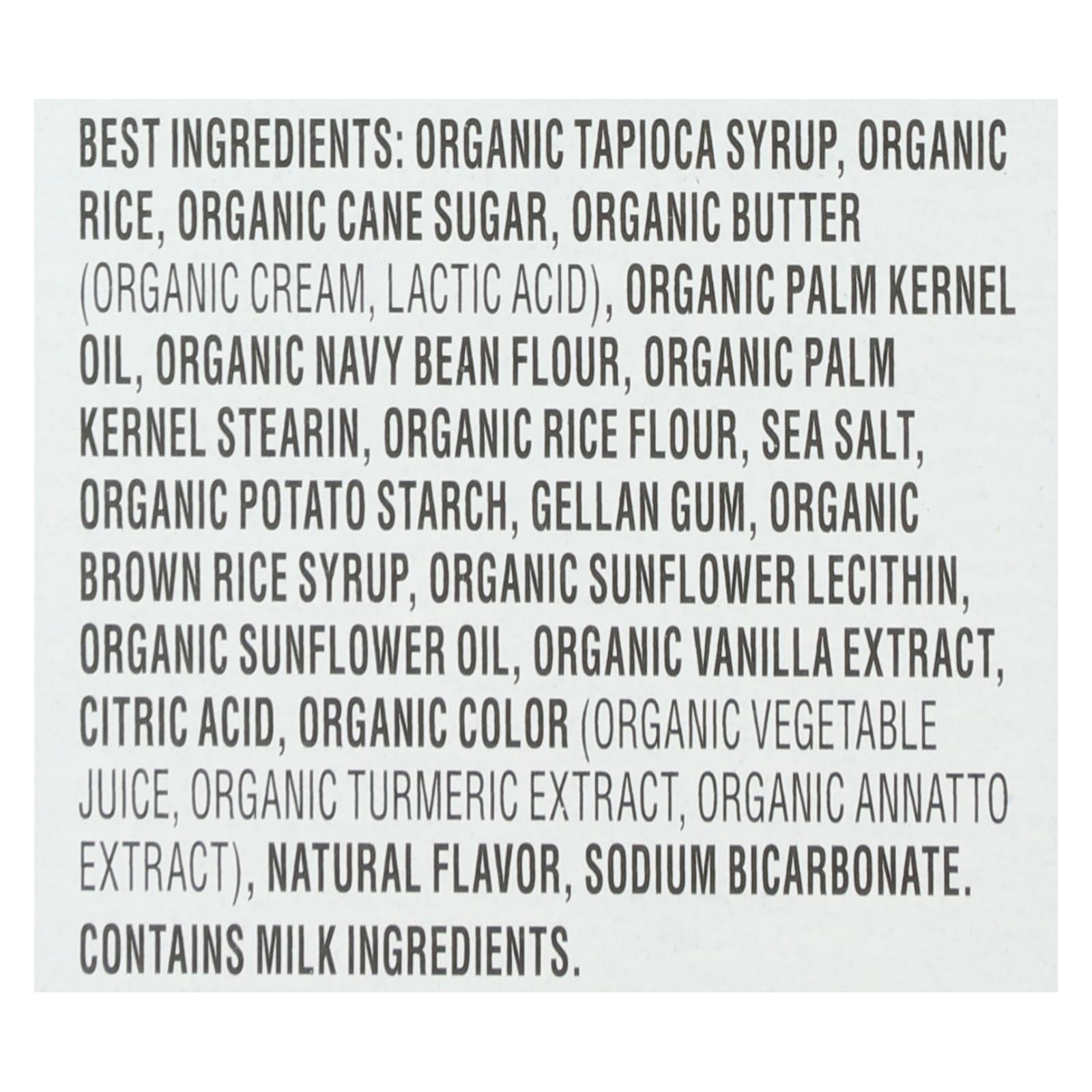 ingredients : organic tapioca syrup;organic rice;organic cane sugar;organic butter (organic cream, lactic acid);organic palm kernel oil;organic navy bean flour;organic palm kernel stearin;organic rice flour;sea salt;organic potato starch;gellan gum;organic brown rice syrup;organic sunflower lecithin;organic sunflower oil;organic vanilla extract;citric acid;organic color (organic vegetable juice, organic turmeric extract, organic annatto extract);natural flavor;sodium bicarbonate