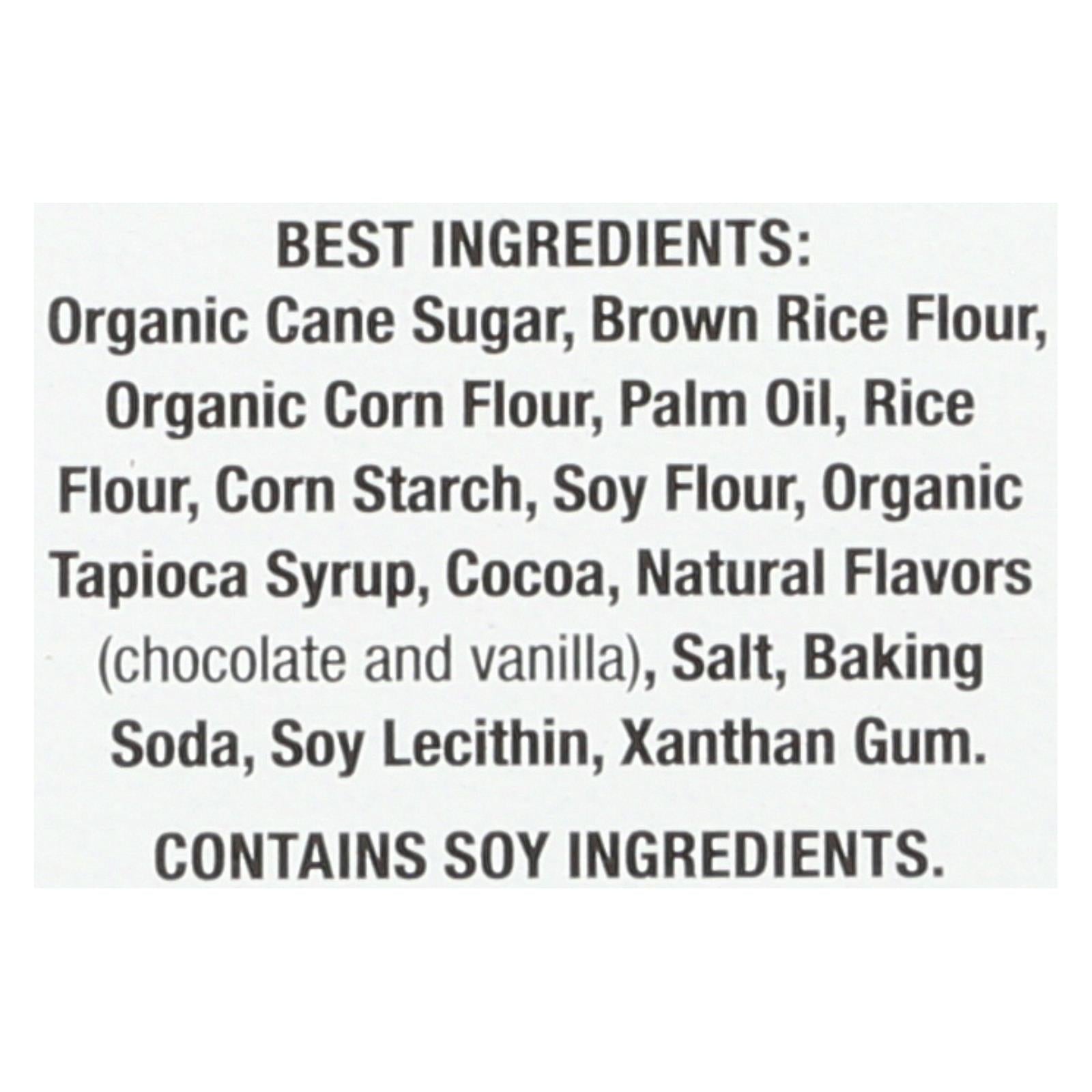 ingredients : organic cane sugar;corn starch;organic palm oil;potato starch;rice flour;soy flour;organic corn flour;organic tapioca syrup;cocoa powder;tapioca starch;natural flavor;leavening (ammonium bicarbonate, sodium bicarbonate, monocalcium phosphate, baking soda);sea salt;soy lecithin;xanthan gum