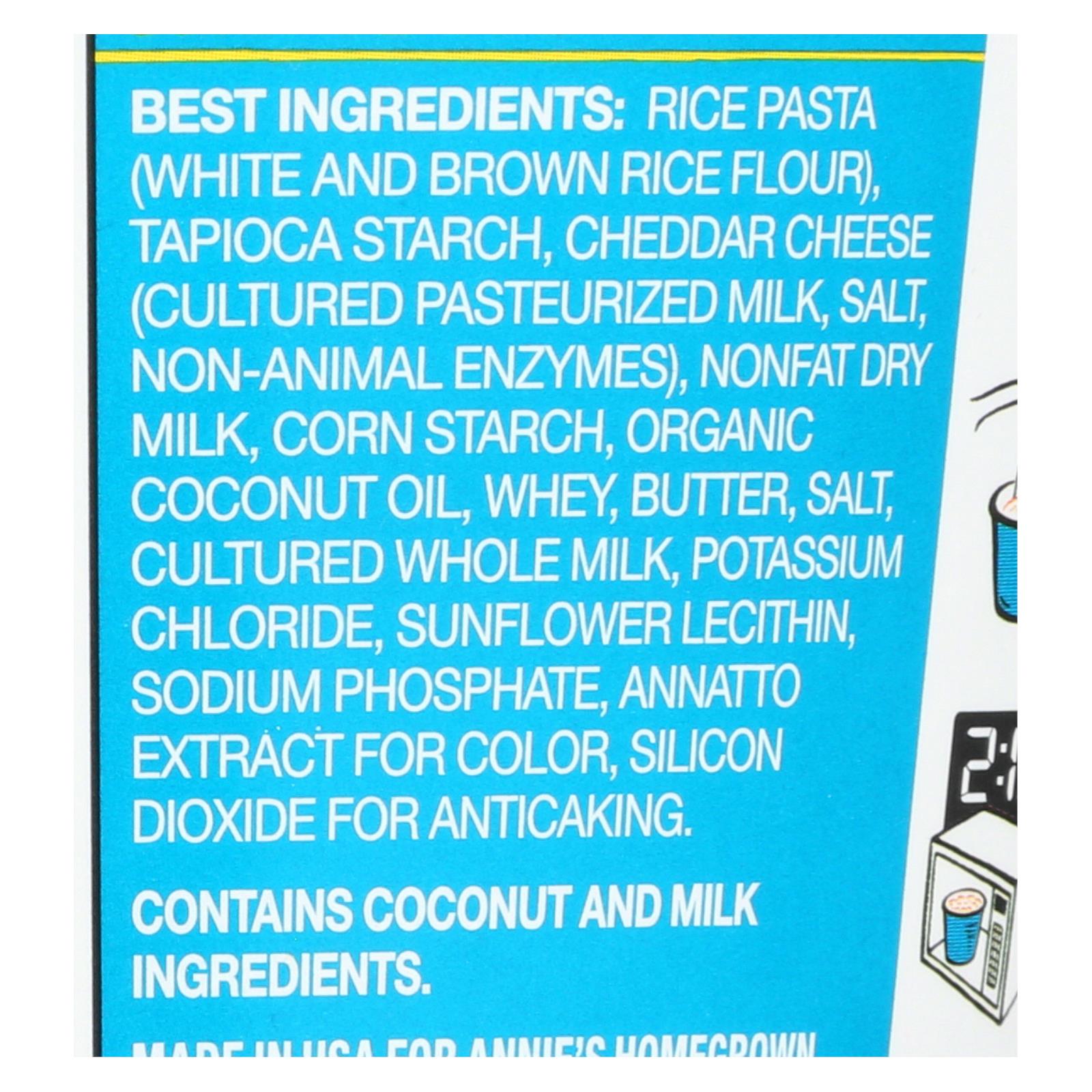 Annie's homegrown single-serve gluten-free macaroni & cheese with rice pasta & cheddar flavor features wholesome ingredients and a rich, creamy taste. Our macaroni and cheese is made with gluten-free rice pasta and cheese that comes from hormone-free cows. You can feel good about serving our macaroni to your family because it's a good source of calcium and doesn't contain any artificial flavors, preservatives, gmos or synthetic colors. Each single-serve container is portable and microwavable for added convenience. Includes one 2.01 oz. Single-serve container of gluten-free macaroni & cheese. Annie’s has a commitment to bettering the world through nourishing foods, honest words and conduct that is considerate and kind. From the farms we source our ingredients from all the way to the packaging our food is shipped in, we are conscious not only of your family’s health and wellness, but that of the planet.