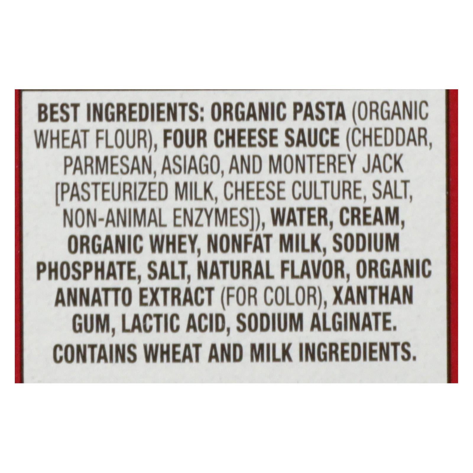 ingredients : organic pasta;organic wheat flour;four cheese sauce;cheddar;parmesan;asiago;and monterey jack [pasteurized milk;cheese culture;salt;non-animal enzymes];water;cream;organic whey;nonfat milk;sodium phosphate;natural flavor;organic annatto extract;for color;xanthan gum;lactic acid;sodium alginate