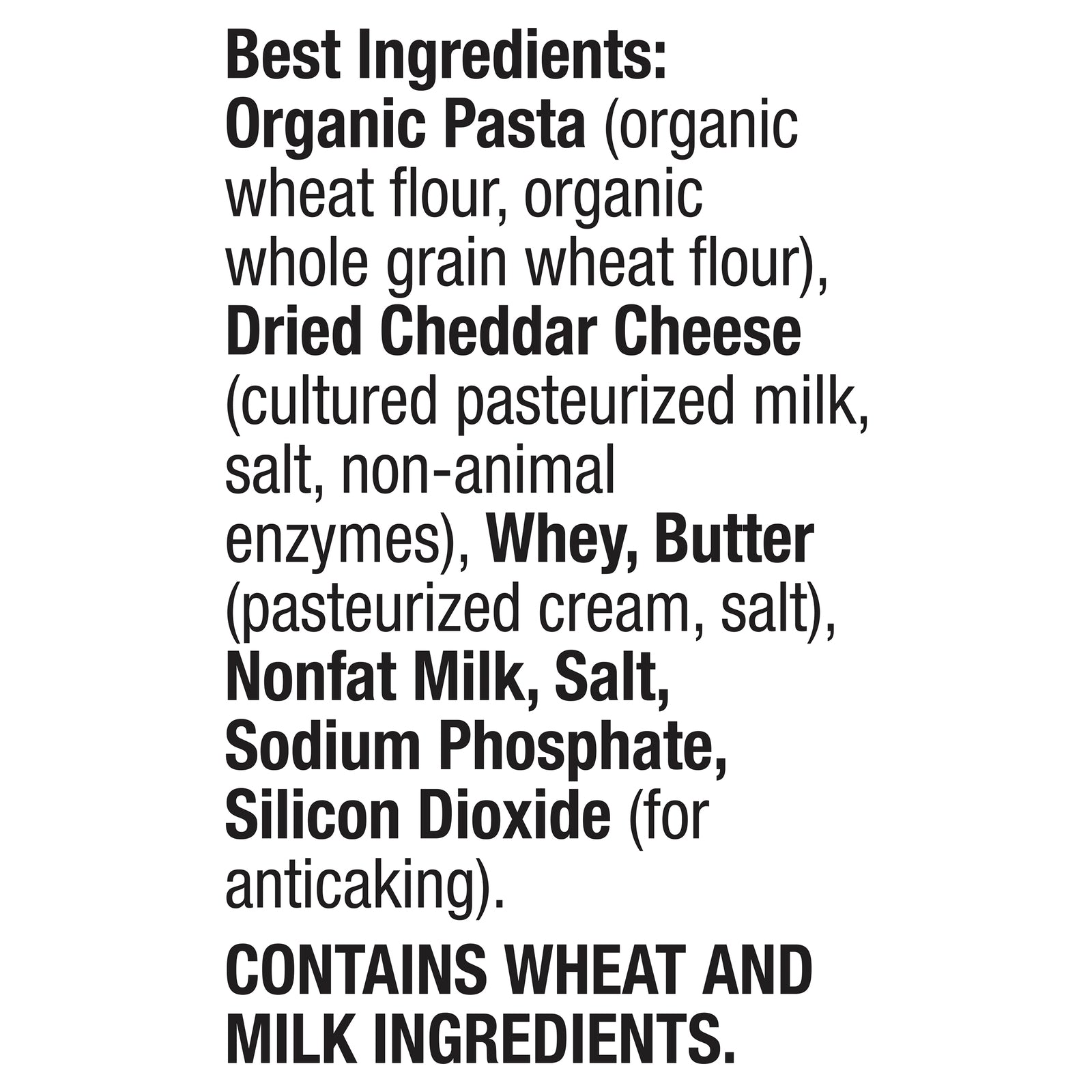 ingredients : organic pasta (organic wheat flour, organic whole grain wheat flour);dried cheddar cheese (cultured pasteurized milk, salt, non-animal enzymes);whey;butter (pasteurized cream, salt);nonfat milk;salt;sodium phosphate;silicon dioxide (for anticaking)