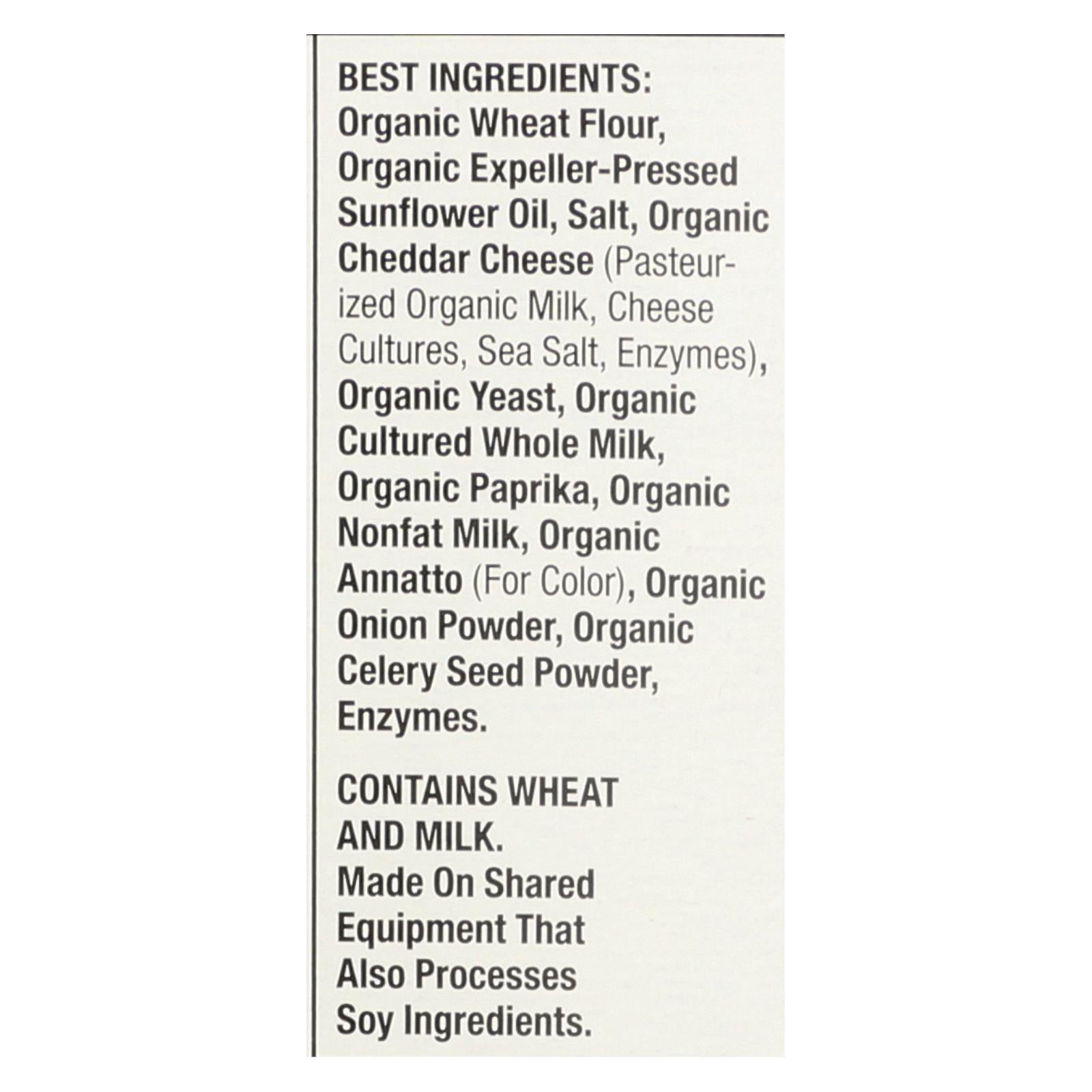 ingredients : best : organic wheat flour;organic expeller-pressed sunflower oil;salt;organic cheddar cheese;pasteurized organic milk;cheese cultures;sea salt;enzymes;organic yeast;organic cultured whole milk;organic paprika;organic nonfat milk;organic annatto;for color;organic onion powder;organic celery seed powder