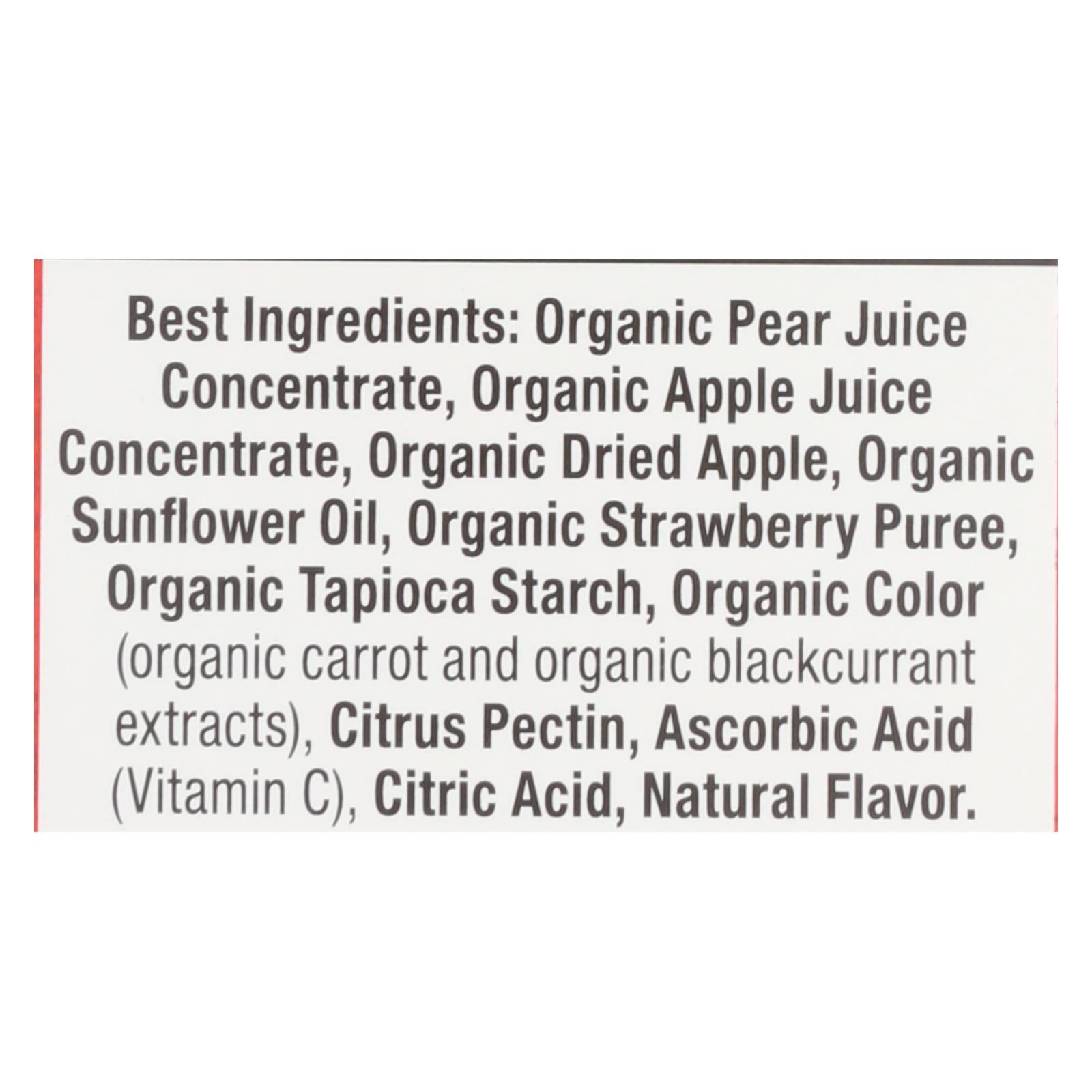 ingredients : organic pear juice concentrate;organic apple juice concentrate;organic dried apple;organic sunflower oil;organic strawberry puree;organic tapioca starch;organic color;organic carrot and organic blackcurrant extracts;citrus pectin;ascorbic acid;vitamin c;citric acid;natural flavor
