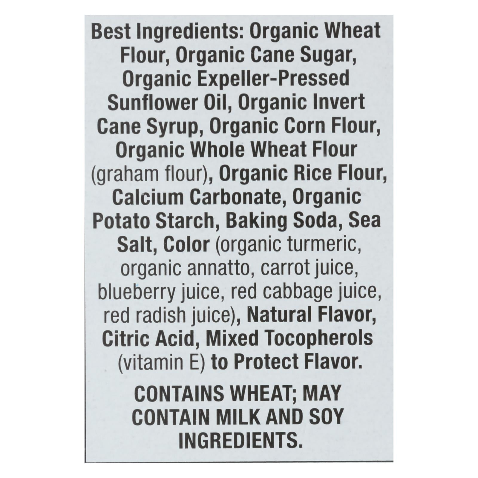 ingredients : organic wheat flour;organic cane sugar;organic expeller-pressed sunflower oil;organic invert cane sugar;organic corn flour;organic whole wheat flour (graham flour);organic rice flour;calcium carbonated;organic potato starch;baking soda;sea salt;color (organic turmeric, organic annatto, carrot juice, blueberry juice, red cabbage juice, red radish juice);natural flavor;citric acid;mixed tocopherols (vitamin e) to protect flavor