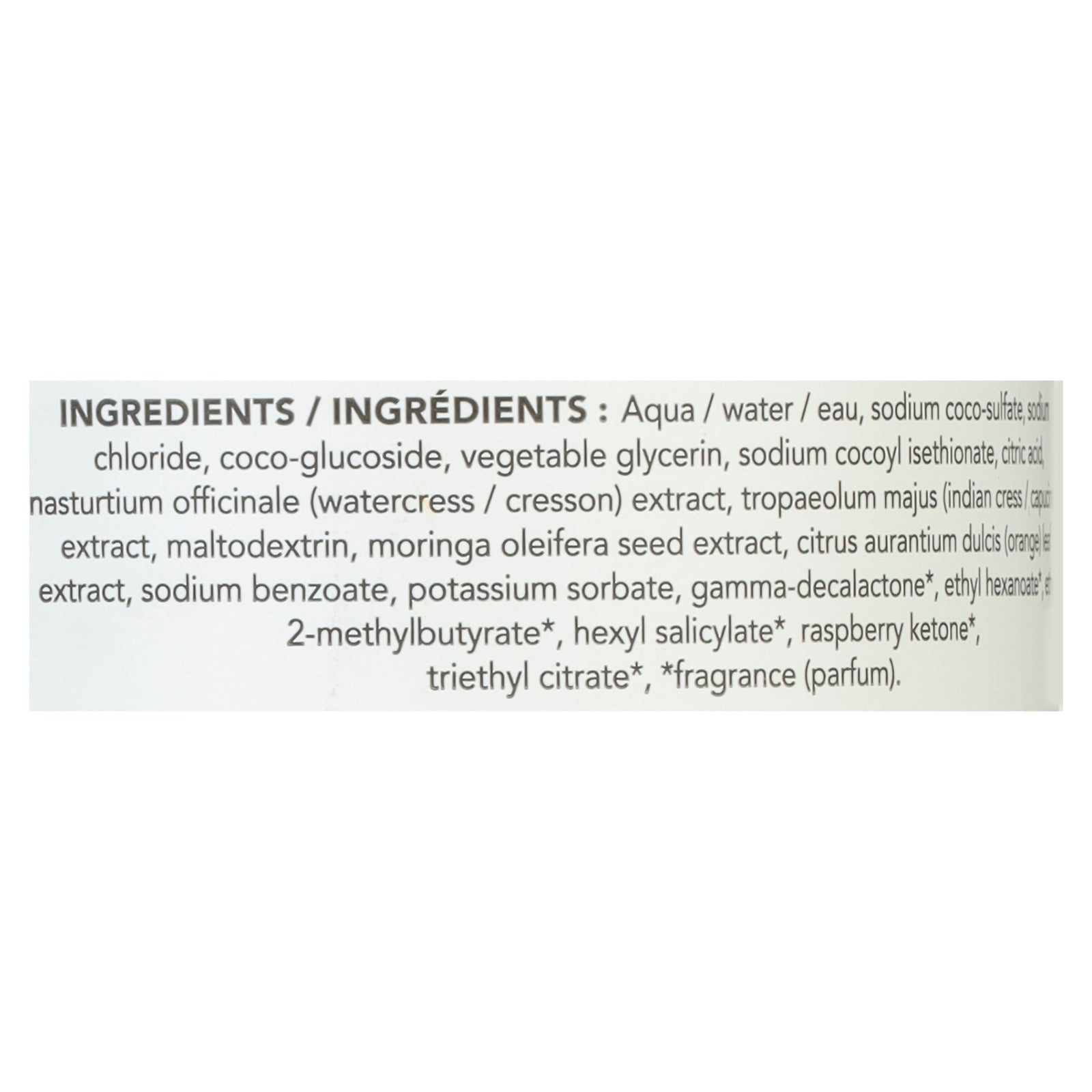 ingredients : aqua / water / eau;sodium coco-sulfate;sodium chloride;coco-glucoside;vegetable glycerin;decyl glucoside;citric acid;nasturtium officinale (watercress) extract;tropaeolum majus (indian cress) extract;maltodextrin;moringa oleifera seed extract;citrus aurantium dulcis (orange) leaf extract;sodium benzoate;potassium sorbate;decanal (fruit);pentadecalactone (fruit);raspberry ketone