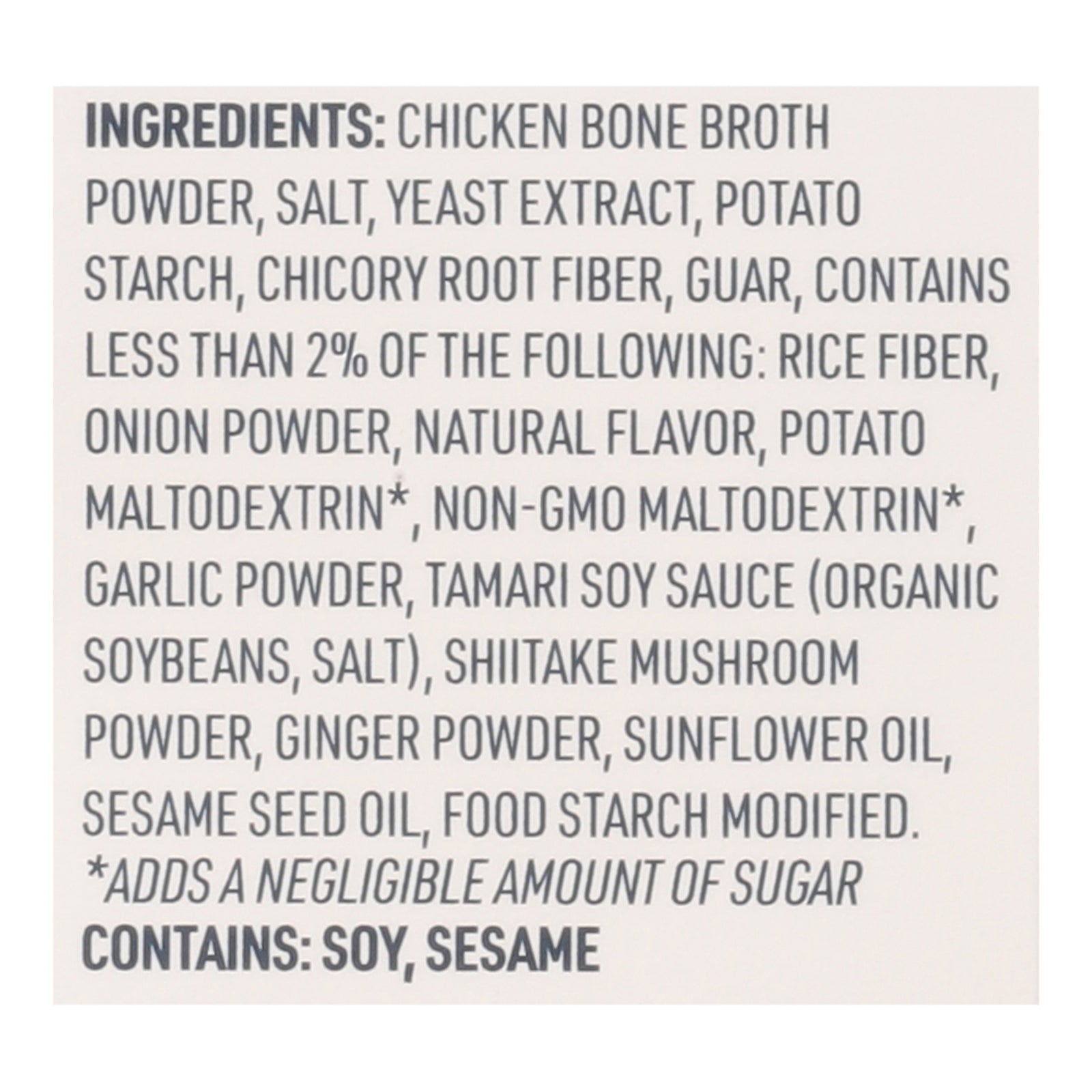 ingredients : chicken bone broth powder;salt;yeast extract;potato starch;chicory root fiber;guar;contains less than 2% of the following: rice fiber, onion powder, natural flavor, potato maltodextrin*, non-gmo maltodextrin*, garlic powder, tamari soy sauce (organic soybeans, salt), shiitake mushroom powder, ginger powder, sunflower oil, sesame seed oil, food starch modified
