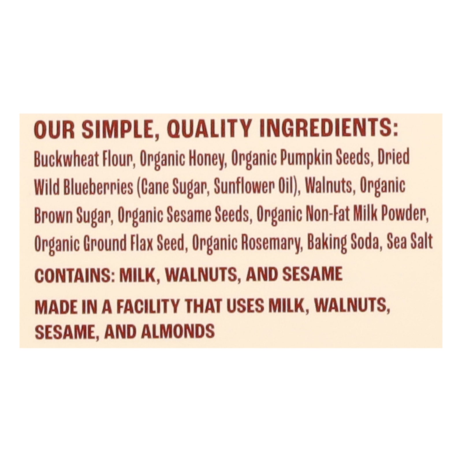 ingredients : buckwheat flour;organic honey;organic pumpkin seeds;dried wild blueberries (cane sugar, sunflower oil);walnuts;organic brown sugar;organic sesame seeds;organic non-fat milk powder;organic ground flax seed;organic rosemary;baking soda;sea salt