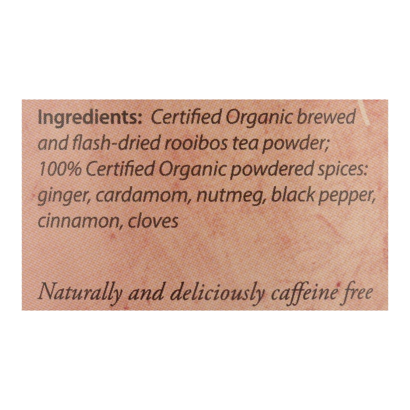 ingredients : certified organic brewed and flash-dried rooibos tea powder;100% certified organic powdered spices: ginger, cardamom, nutmeg, black pepper, cinnamon, cloves