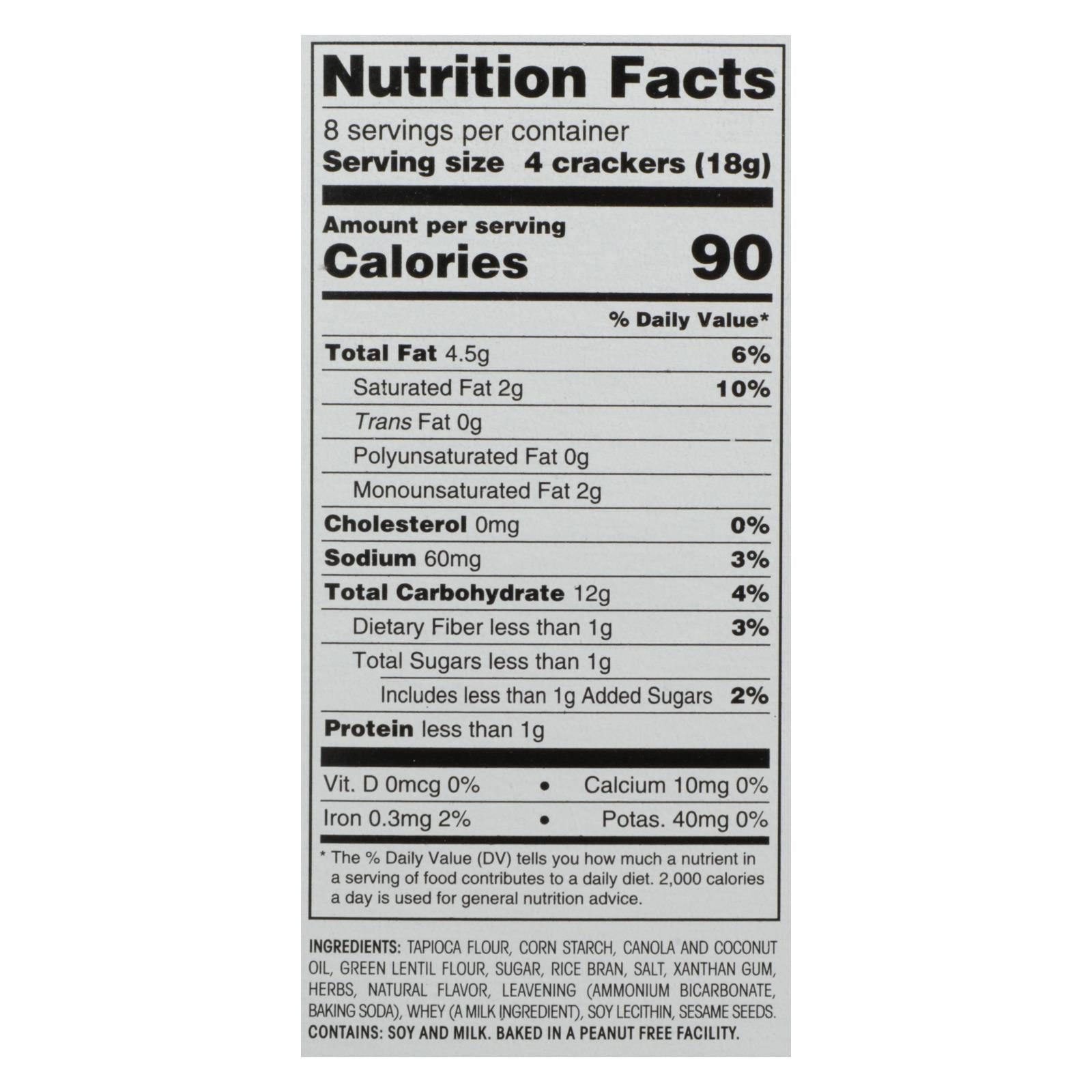 ingredients : tapioca flour;corn starch;canola and coconut oil;green lentil flour;sugar;rice bran;salt;xanthan gum;herbs;natural flavor;leavening;ammonium bicarbonate;baking soda;whey;a milk ingredient;soy lecithin;sesame seeds