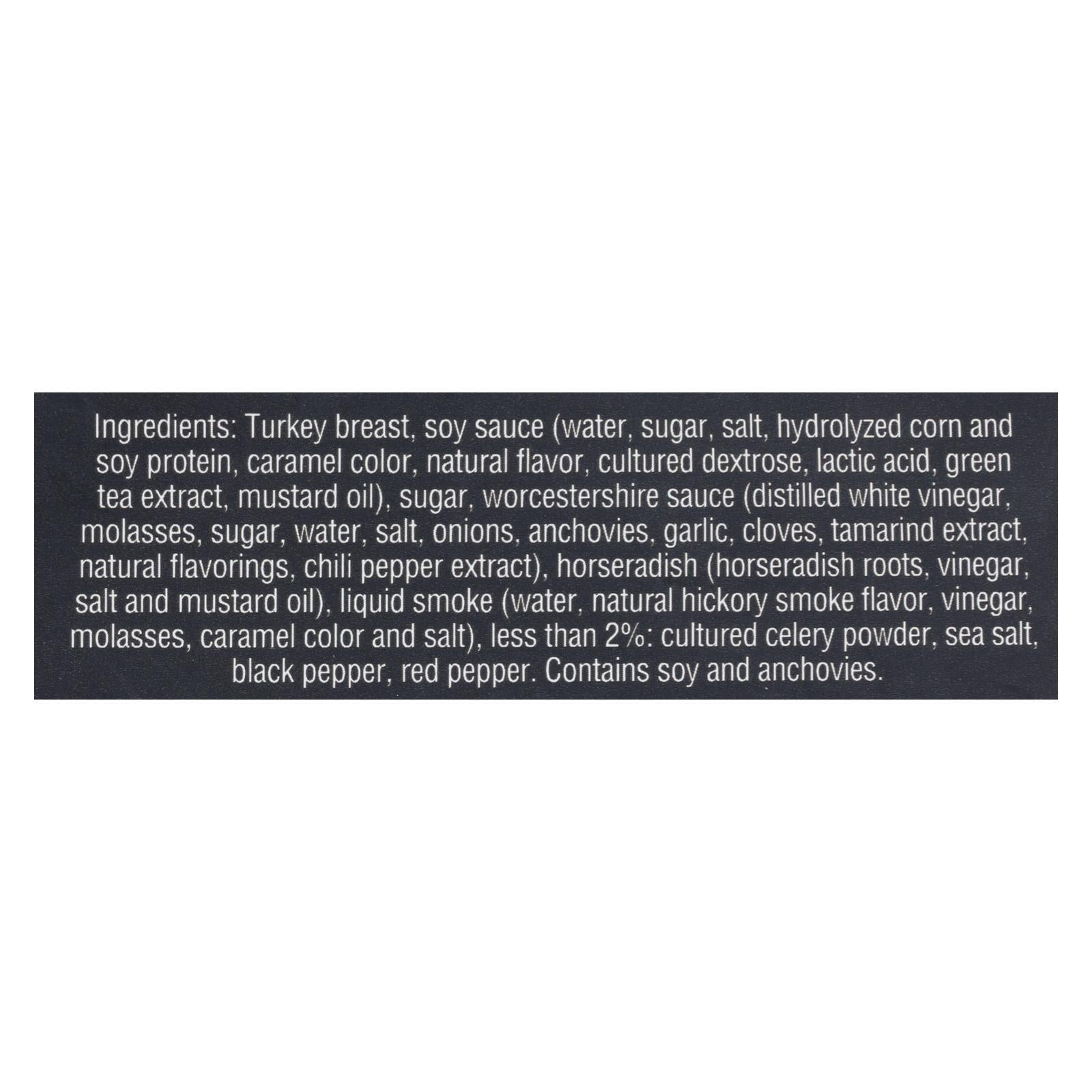 ingredients : turkey breast;soy sauce (water, sugar, salt, hydrolyzed corn and soy protein, caramel color, natural flavor, cultured dextrose, lactic acid, green tea extract, mustard oil);sugar;worcestershire sauce (distilled white vinegar, molasses, sugar, water, salt, onions, anchovies, garlic, cloves, tamarind extract, natural flavorings, chili pepper extract);horseradish (horseradish roots, vinegar, salt and mustard oil);liquid smoke (water, natural hickory smoke flavor, vinegar, molasses, caramel color an
