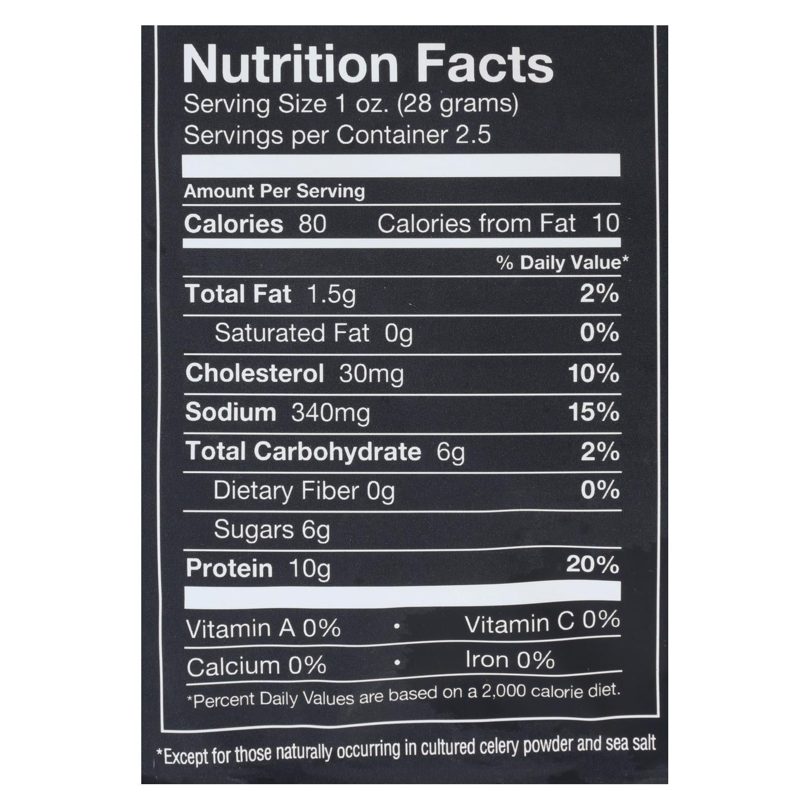 High in protein. 12 g protein per serving. Made with turkey breast. Smoke flavor added. Smoked turkey breast. Certified gluten-free by the gluten free certification organization. Www.gfco.org. No nitrites (except for those naturally occurring in celery powder and sea salt). Inspected for wholesomeness by us department of agriculture. Handcrafted. Perfectly tender. Real ingredients. Chef-crafted marinade. Slow smoked. Cut by hand. Jerky is an incredible invention. It can go anywhere, endure the elements, feed our hunger and sometimes attract bears. But jerky hasn't been living up to its potential. It's been lost in mystery meats and spices so hot you sweat for a week. Chef's cut real jerky is redefining your favorite protein snack, hand-cutting premium meats and smoking them to tender perfection. With flavors this bold, you'd expect nothing less from founder and culinary mastermind chef blair swiler, who hates mysteries, but loves tell-all. Chef's cut real jerky is the jerky you've always wanted. It's jerky done right. Dig in. Keepin' it real: we didn't believe it was possible to make jerky from a bird and make it taste as delicious as jerky from a cow. How wrong that was! - shanrah & brock, los angeles, ca. Www.chefscutrealjerky.com. Facebook/chefcutrealjerky. Instagram. Twitter. (at)chefscutjerky. Product of usa.