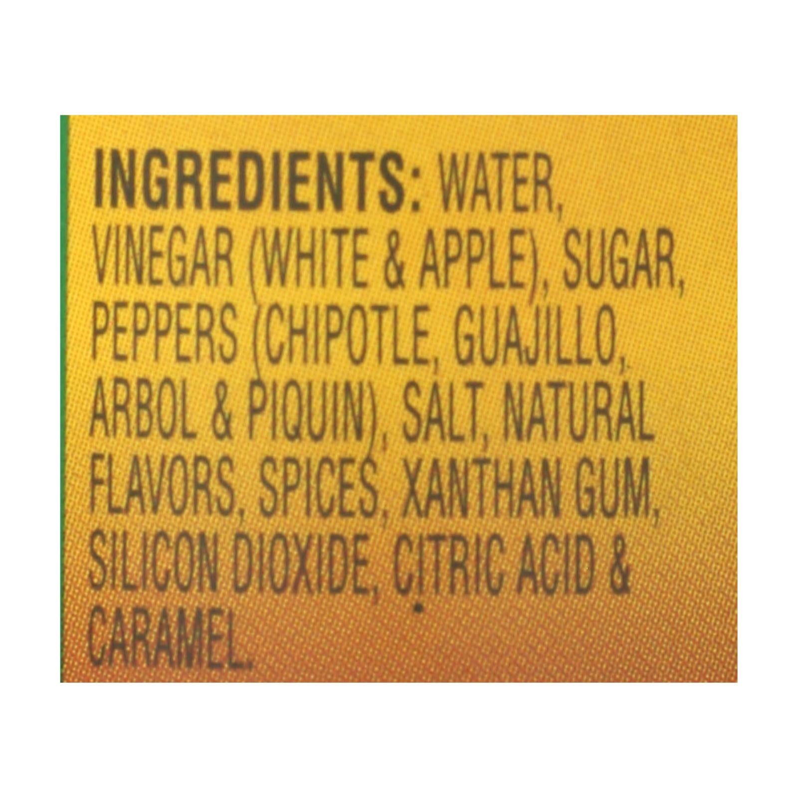 ingredients : water;vinegar (white & apple);sugar;peppers (chipotle, guajillo, arbol & piquin);salt;natural flavors;spices;xanthan gum;silicon dioxide;citric acid & caramel