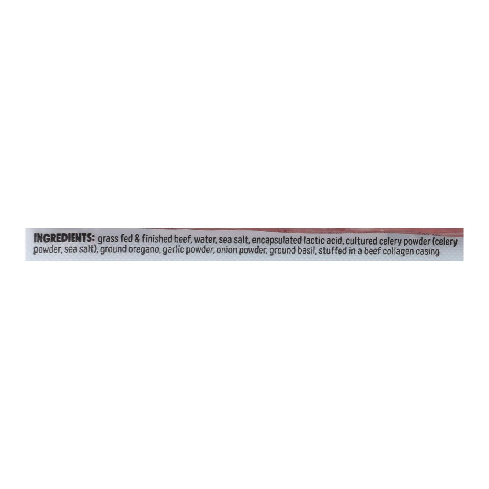 ingredients : grass fed & finished beef;water;sea salt;encapsulated lactic acid;cultured celery powder (celery powder, sea salt);ground oregano;garlic powder;onion powder;ground basil;stuffed in a beef collagen casing