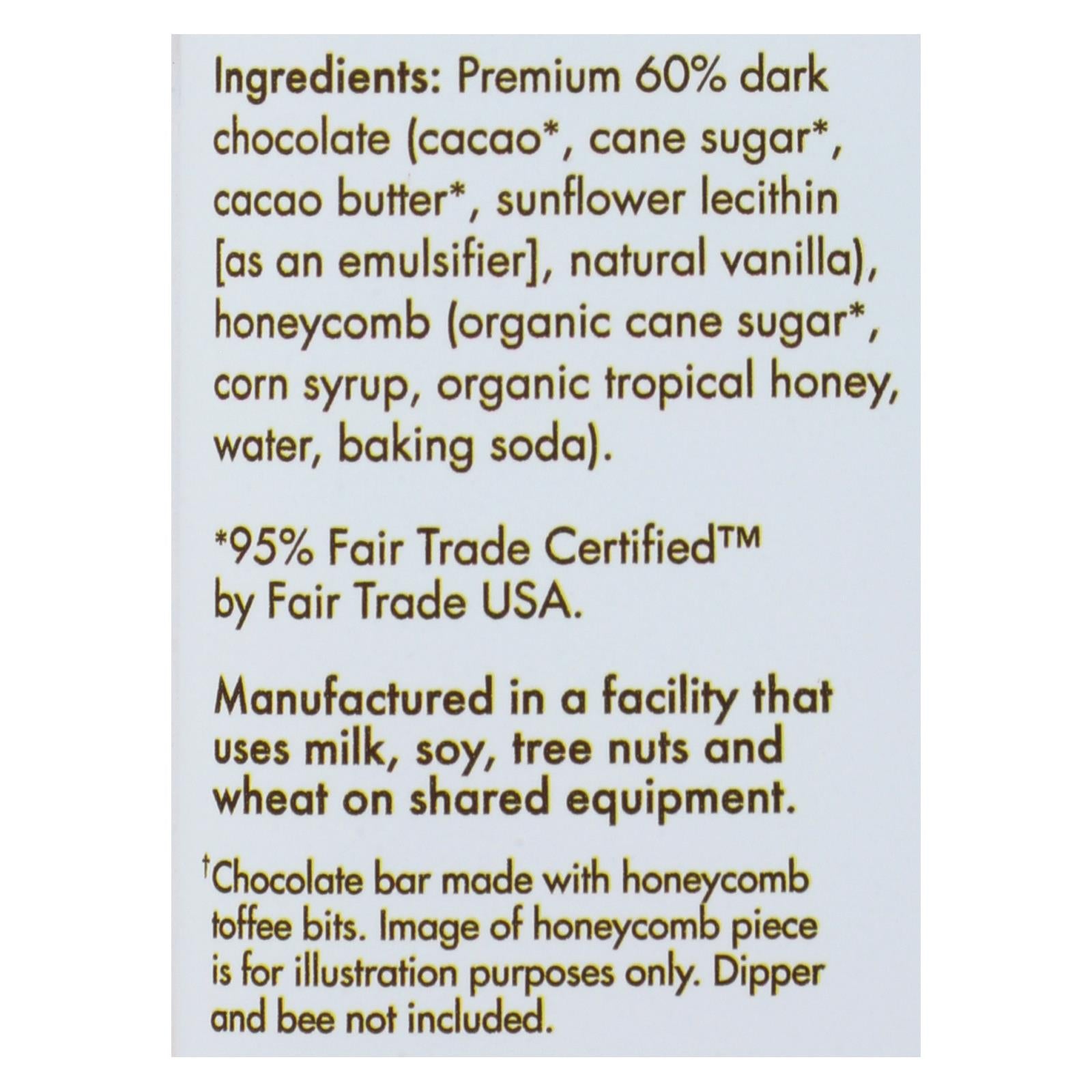 ingredients : premium 60% dark chocolate;cacao;cane sugar;cacao butter;sunflower lecithin [as an emulsifier];natural vanilla;honeycomb;organic cane sugar;corn syrup;organic tropical honey;water;baking soda