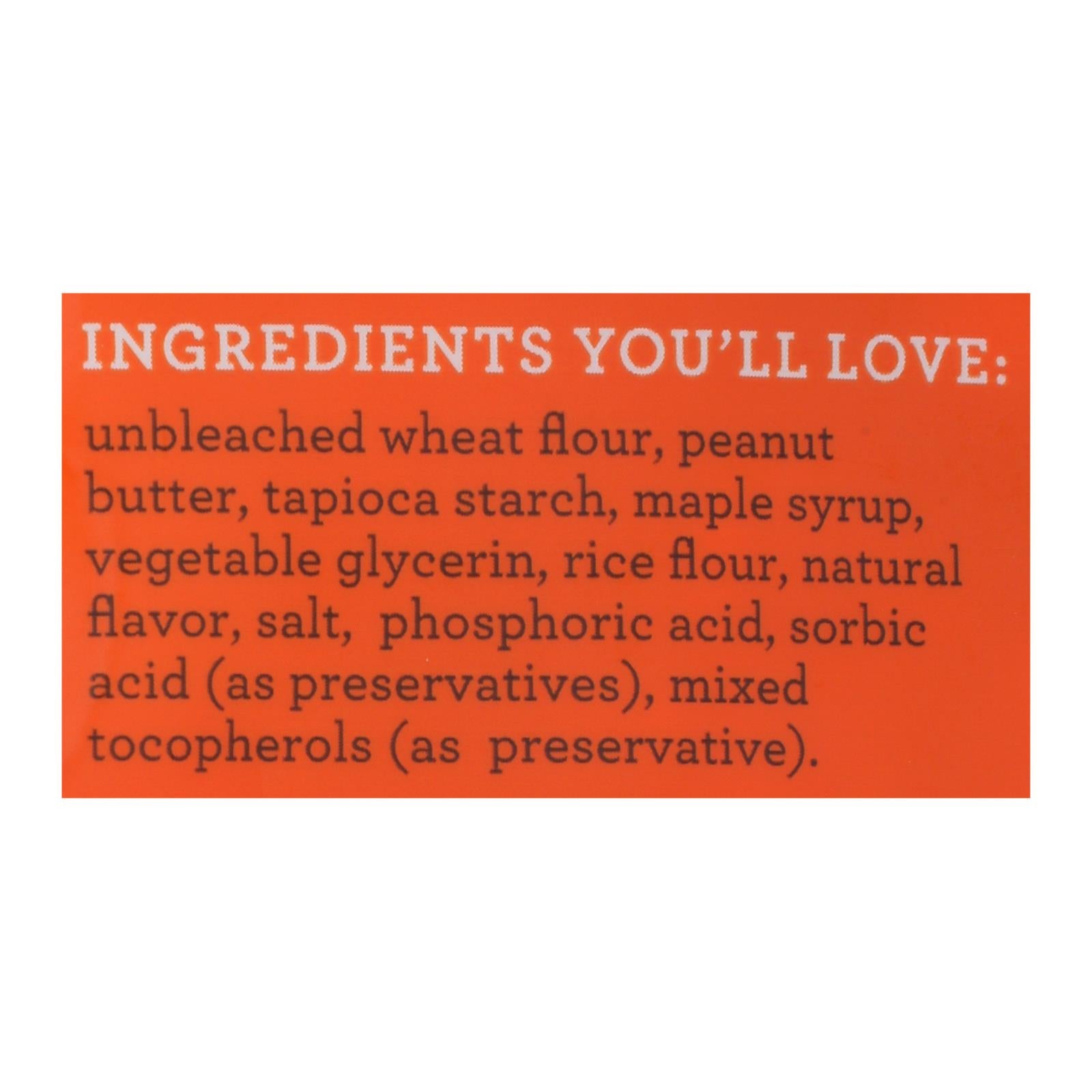 ingredients : whole wheat flour;peanut butter;vegetable glycerin;brown rice flour;tapioca starch;ground flaxseed;pork broth;gelatin;maple syrup;coconut oil;mixed tocopherols (preservative);rosemary extract