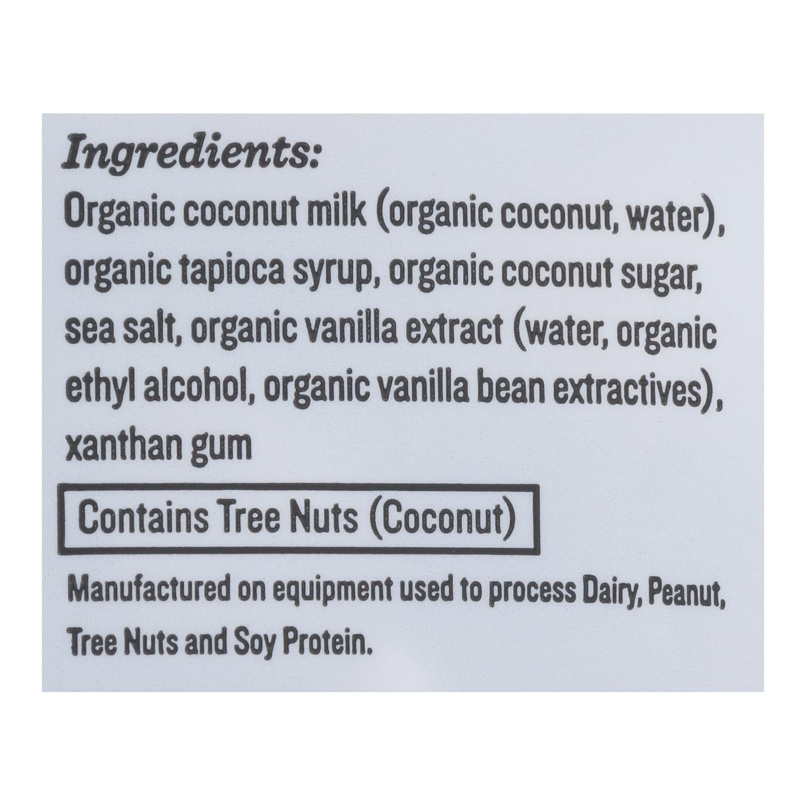 ingredients : organic coconut milk;organic coconut;water;organic tapioca syrup;organic coconut sugar;sea salt;organic vanilla extract;organic ethyl alcohol;organic vanilla bean extractives;xanthan gum