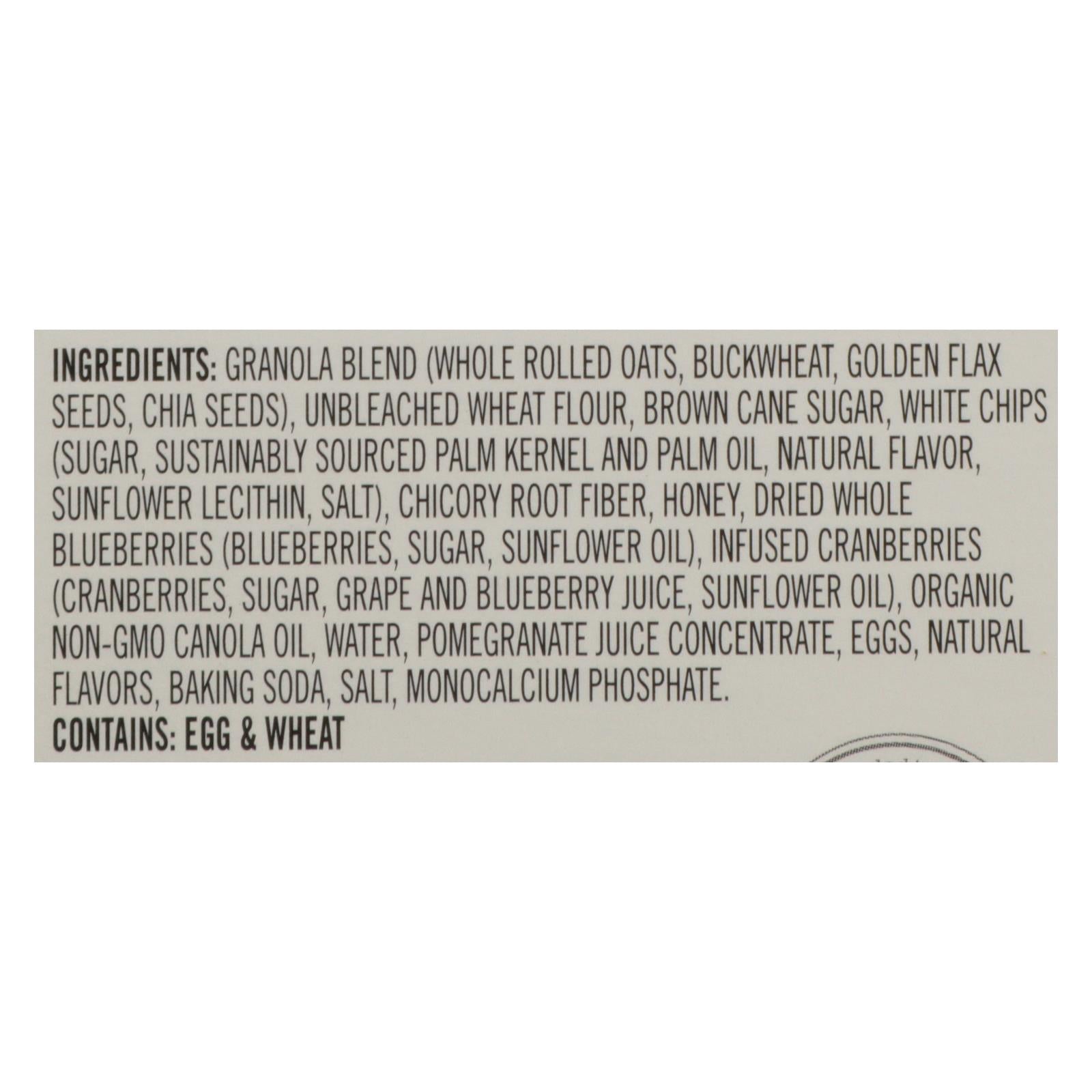 ingredients : granola blend (whole rolled oats, buckwheat, golden flax seeds, chia seeds);unbleached wheat flour;brown cane sugar;white chips (sugar, sustainably sourced palm kernel and palm oil, natural flavor, sunflower lecithin, salt);chicory root fiber;honey;dried whole blueberries (blueberries, sugar, sunflower oil);infused cranberries (cranberries, sugar, grape and blueberry juice, sunflower oil);organic non-gmo canola oil;water;pomegranate juice concentrate;eggs;natural flavors;baking soda;salt;monocal