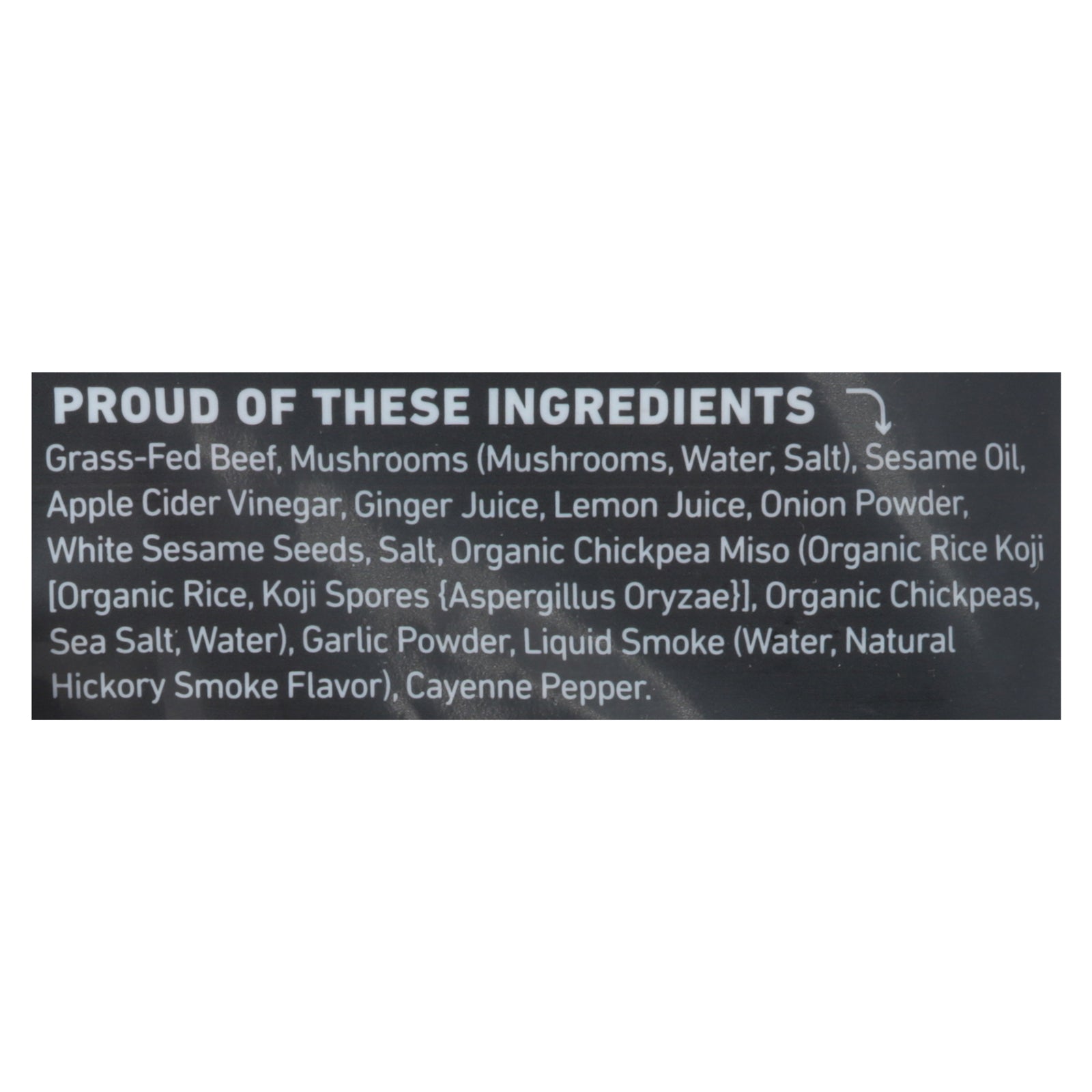 ingredients : grass-fed beef;mushrooms;water;salt;sesame oil;apple cider vinegar;ginger juice;lemon juice;onion;organic chickpea miso;organic rice koji [organic rice;koji spores {aspergillus oryzae}];organic chickpeas;sea salt;garlic;toasted sesame seeds;liquid smoke;natural hickory smoke flavor;cayenne pepper