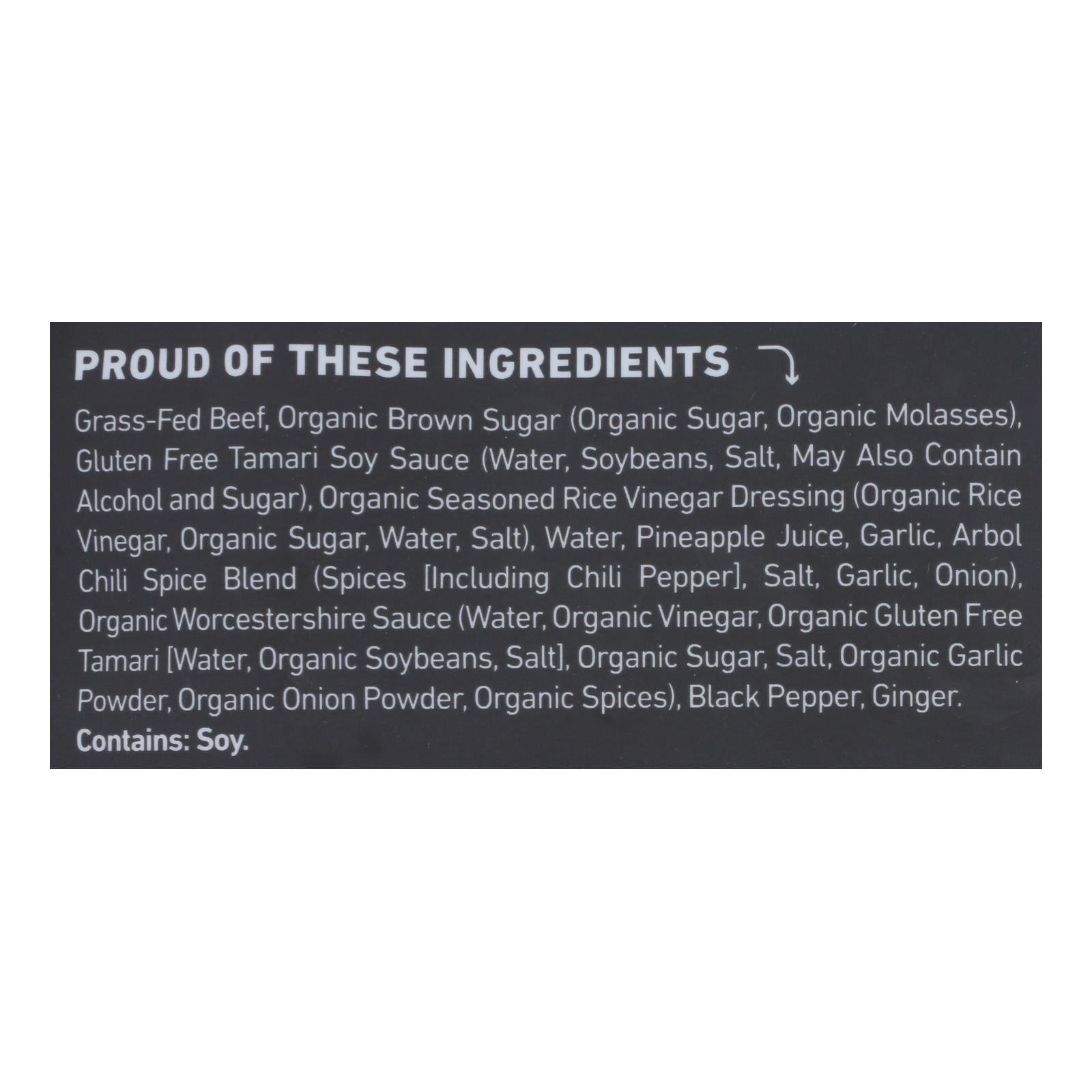 ingredients : grass-fed beef;organic brown sugar (organic sugar, organic molasses);gluten free tamari soy sauce (water, soybeans, salt, may also contain alcohol and sugar);organic seasoned rice vinegar dressing (organic rice vinegar, organic sugar, water, salt);water;pineapple juice;garlic powder;arbol chili spice blend (spices [including chili pepper], salt, garlic, onion);organic worcestershire sauce (water, organic vinegar, organic gluten free tamari [water, organic soybeans, salt], organic sugar, salt, or