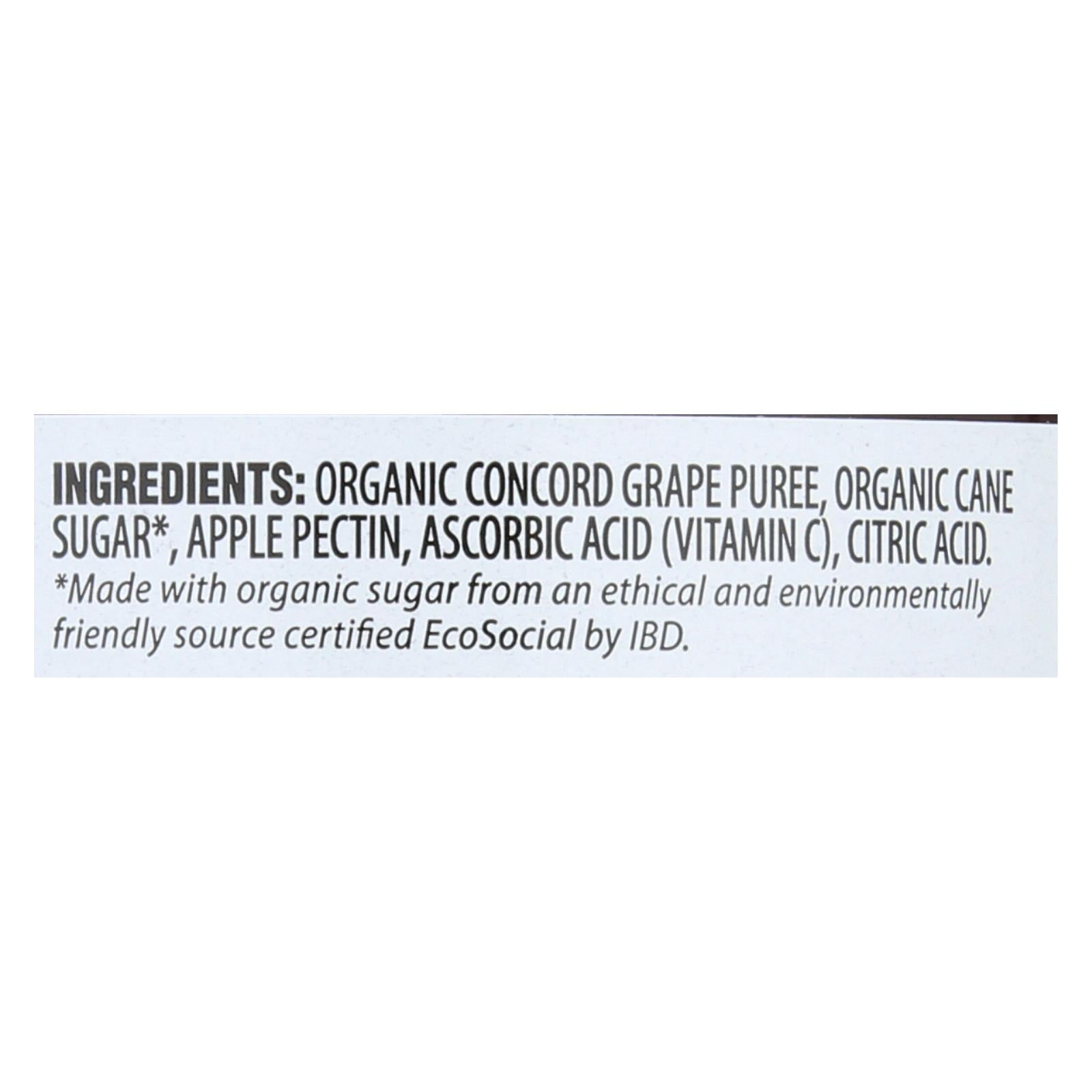 ingredients : organic concord grape puree from concentrate (water, organic concord grape puree concentrate);organic cane sugar;apple pectin;ascorbic acid (vitamin c);citric acid