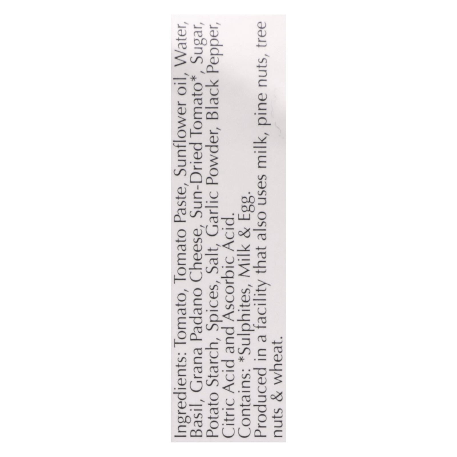 ingredients : tomato;tomato paste;sunflower oil;water;basil;grana padano cheese;sun-dried tomato;sugar;potato starch;spices;salt;garlic powder;black pepper;citric acid and ascorbic acid
