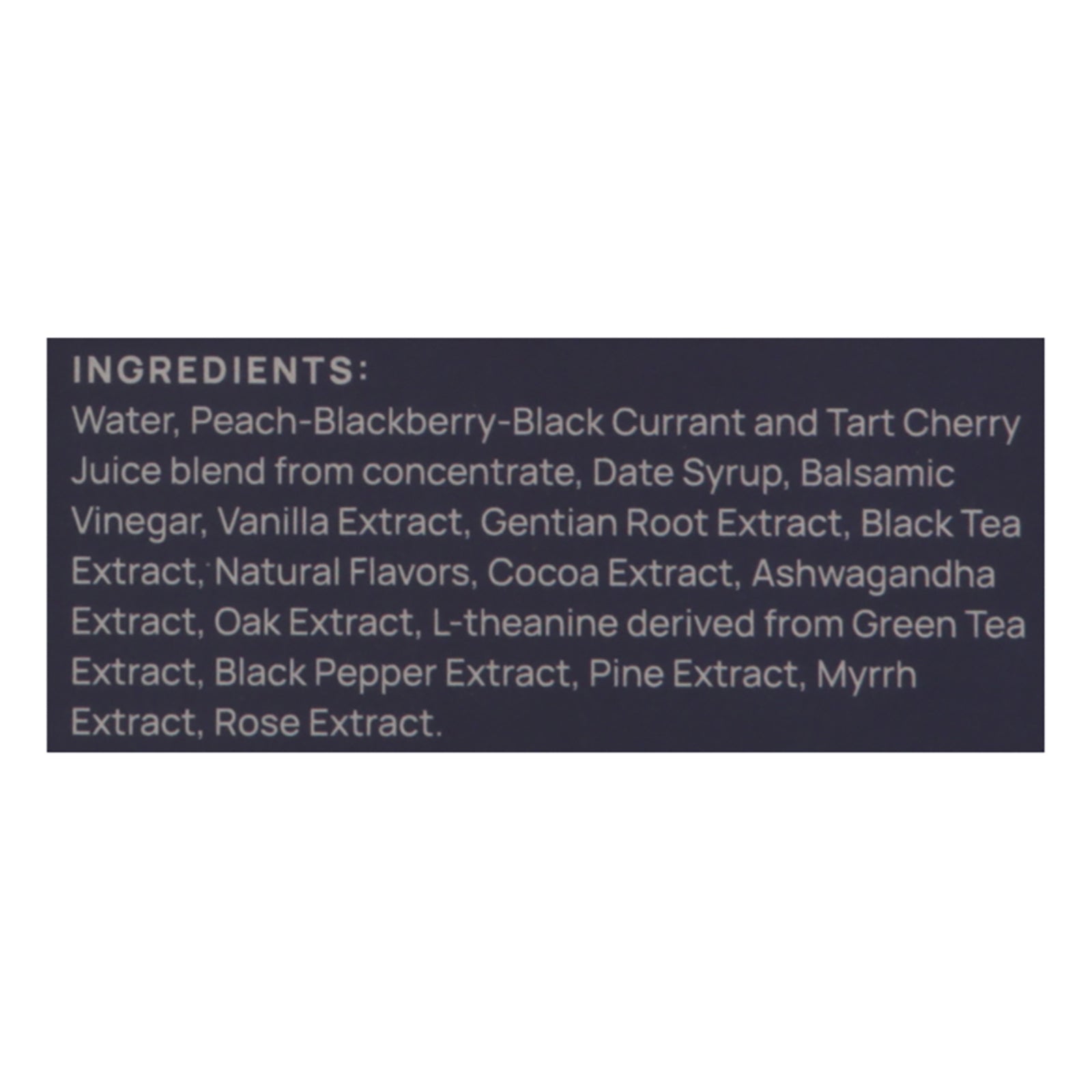 ingredients : water;peach-blackberry-black currant and tart cherry juice blend from concentrate;date syrup;balsamic vinegar;vanilla extract;gentian root extract;black tea extract;natural flavors;cocoa extract;ashwagandha extract;oak extract;l-theanine derived from green tea extract;black pepper extract;pine extract;myrrh extract;rose extract