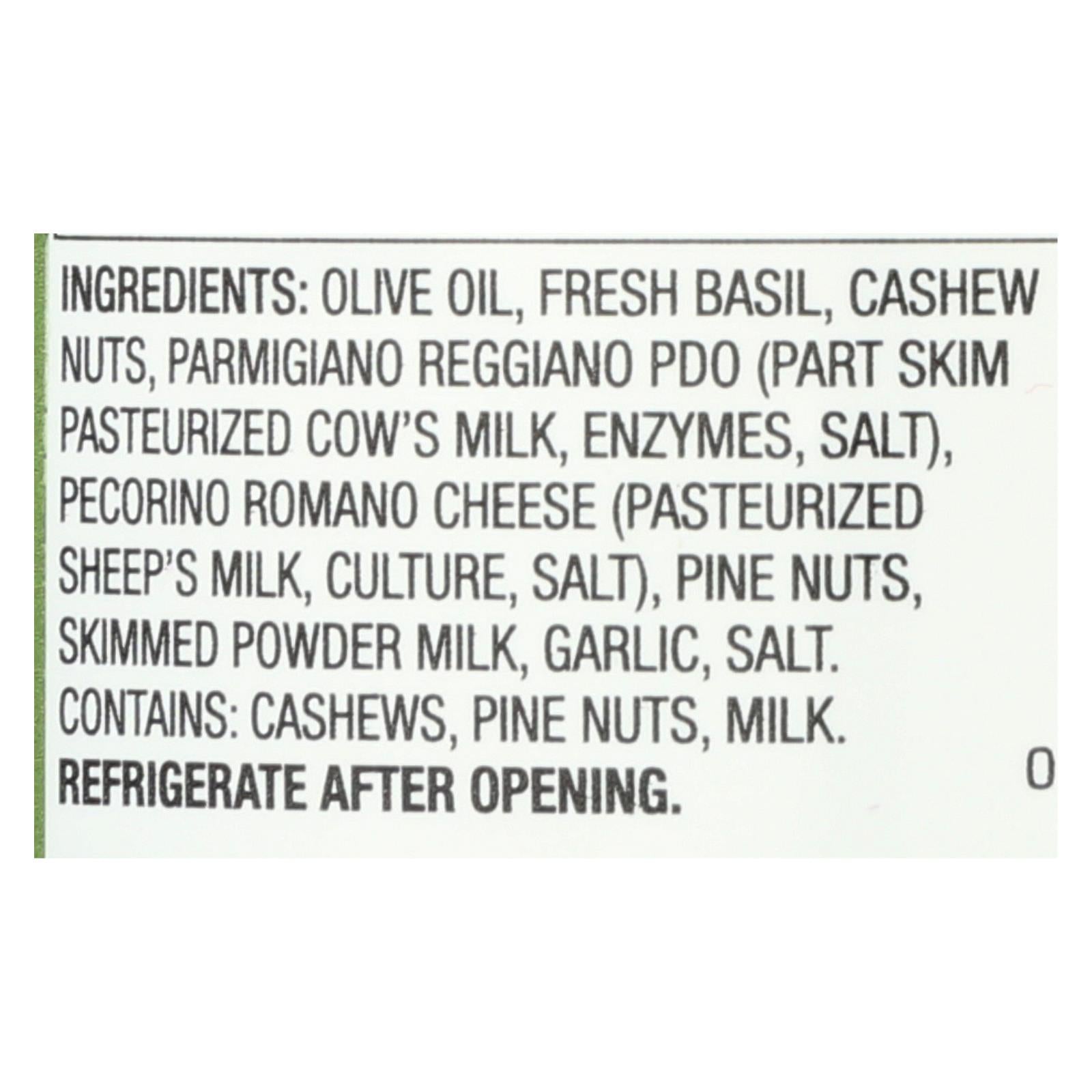 ingredients : olive oil;fresh basil;cashew nuts;parmigiano reggiano pdo (part skim pasteurized cow s milk, enzymes, salt);pecorino romano cheese (pasteurized sheep's milk, culture, salt);pine nuts;skimmed powder milk;garlic;salt