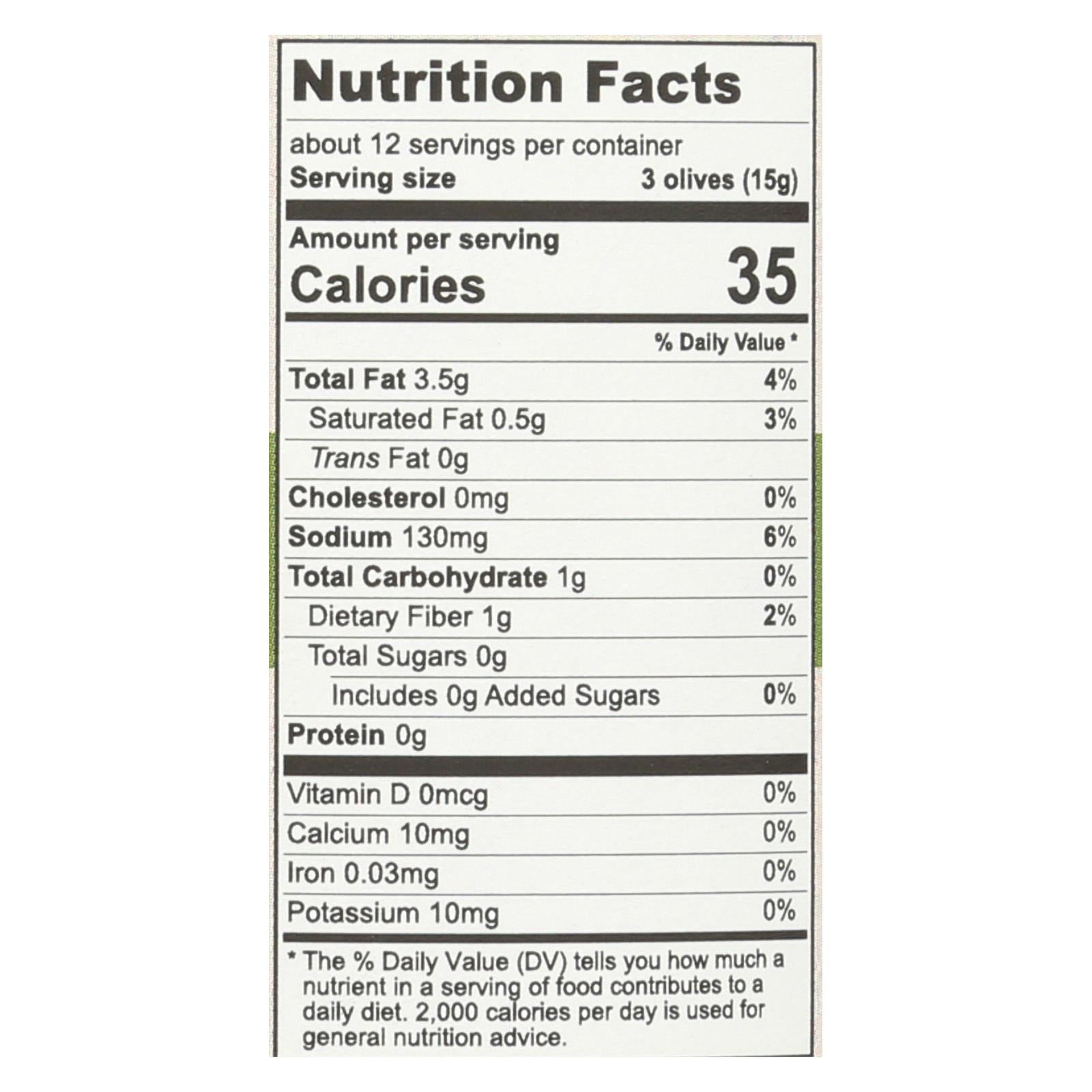 Divina castelvetrano olives are a delicate snack or delicious addition to a variety of meals. These whole olives are prepared in a brine free from harmful or unnecessary additives, preserving the pure, natural taste of the olive itself. The sharp taste of these green olives can complement a variety of dishes or they can stand on their own. Each jar of divina castelvetrano olives contains approximately 12 servings and 35 calories per serving. Additionally, with 30 calories from fat in each serving, divina castelvetrano olives can contribute to a healthy fat intake, as part of a balanced diet. See nutrition facts panel for allergens. Includes one 10.2 oz. Jar of divina castelvetrano olives.