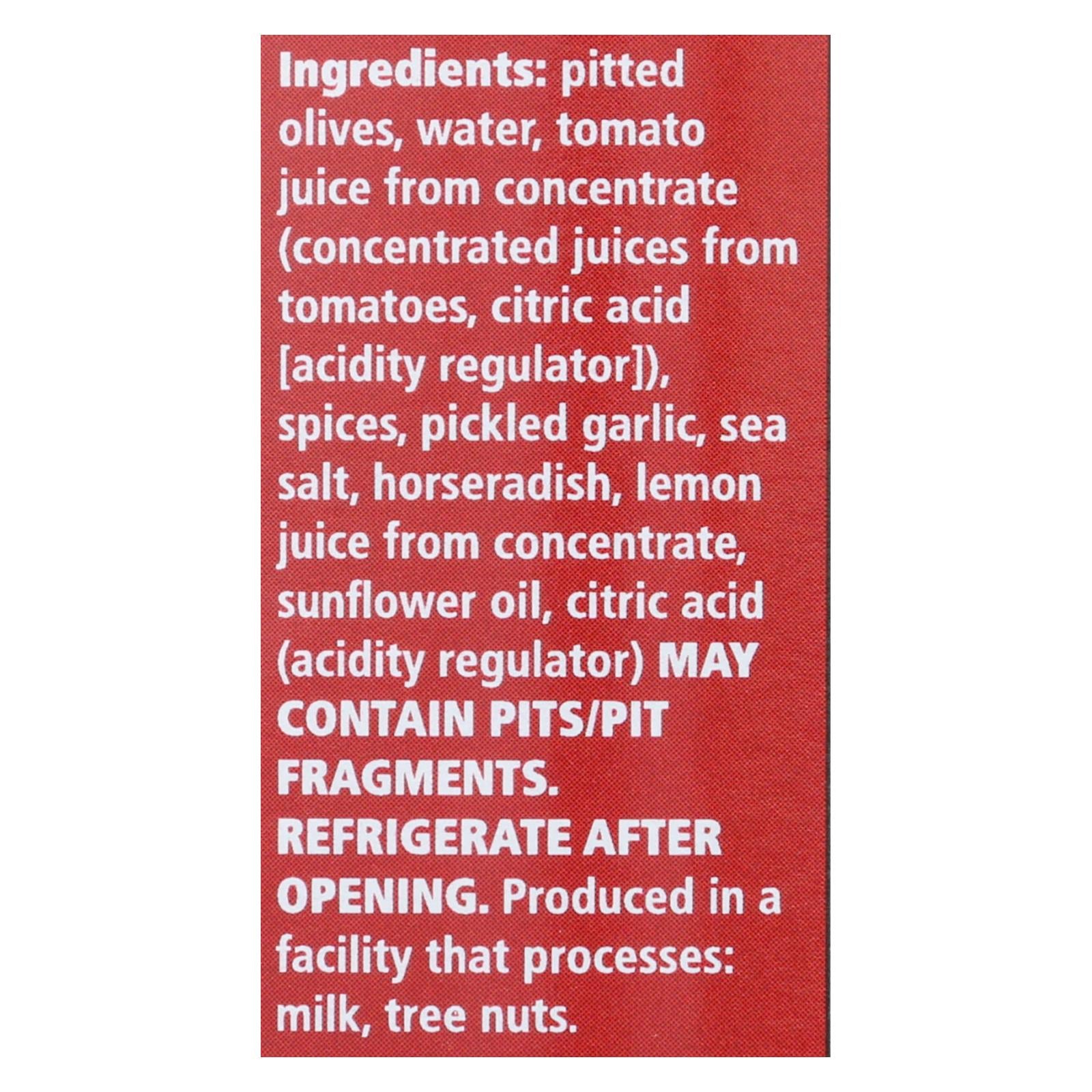 ingredients : pitted olives;water;tomato juice from concentrate;concentrated juices from tomatoes;citric acid [acidity regulator];spices;pickled garlic;sea salt;horseradish;lemon juice from concentrate;sunflower oil;citric acid;acidity regulator