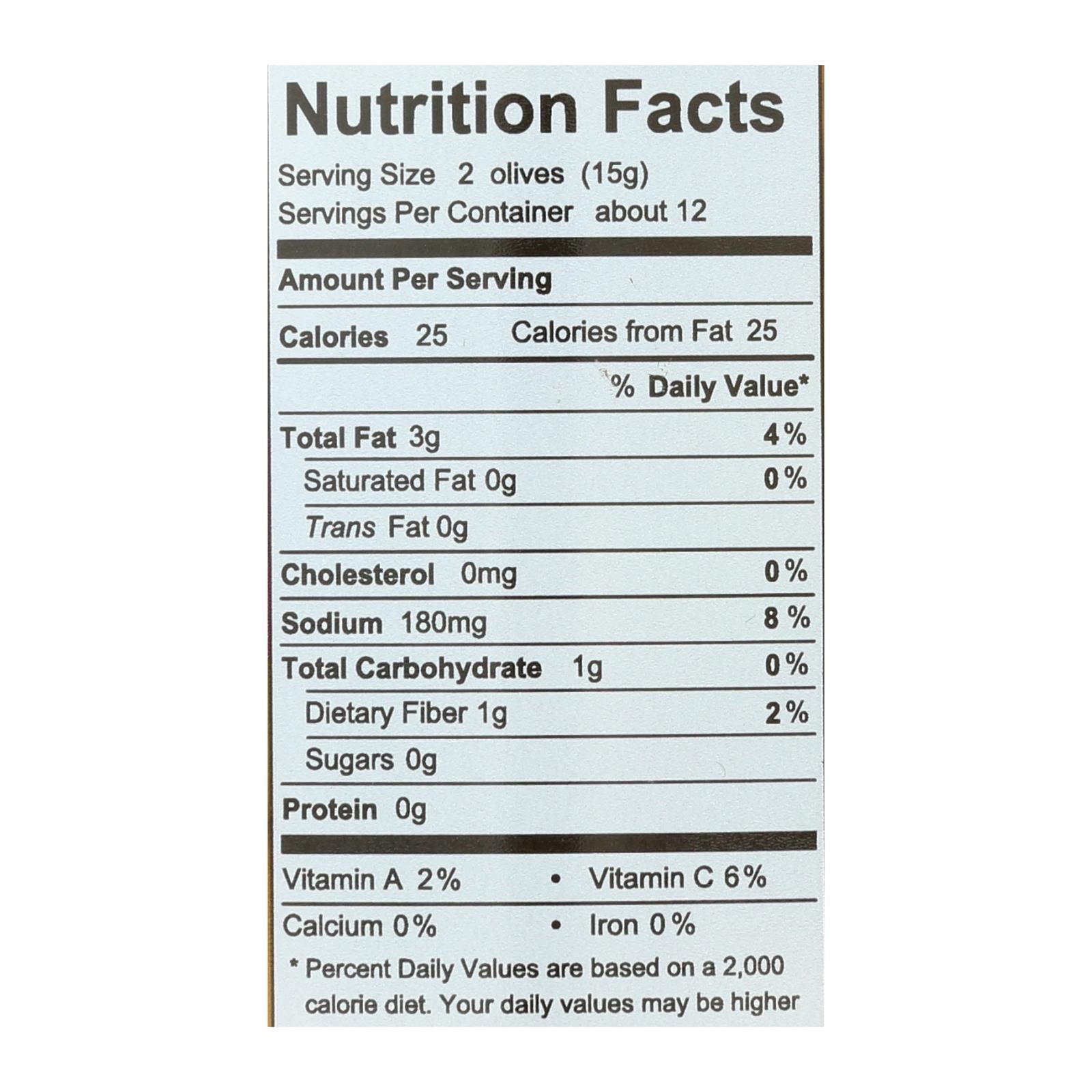 Divina olives stuffed with sweet red peppers are a delicate snack or delicious addition to a variety of meals. These olives are prepared in a brine free from harmful or unnecessary additives, preserving the pure, natural taste of the olive itself. Additionally, these olives are stuffed with sweet peppers, giving them a unique, sweet and spicy flavor. The sharp taste of these olives can complement a variety of dishes or they can stand on their own. Each jar of divina olives stuffed with sweet red peppers contains approximately 12 servings and 25 calories per serving. Additionally, with 25 calories from fat in each serving, divina olives stuffed with sweet red peppers can contribute to a healthy fat intake, as part of a balanced diet. See nutrition facts panel for allergens. Includes one 13.4 oz. Jar of divina olives stuffed with sweet red peppers.