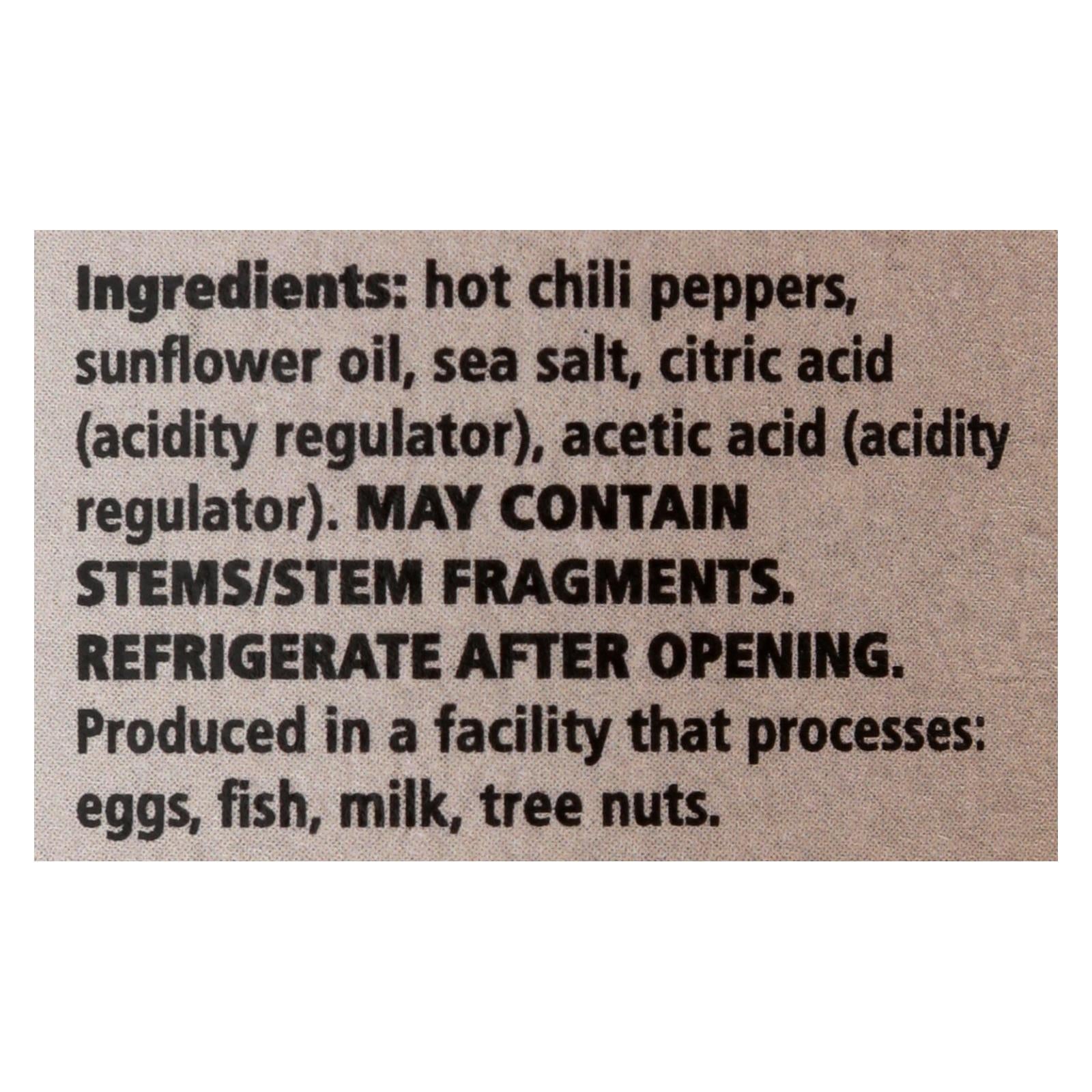 ingredients : hot chili peppers;sunflower oil;sea salt;citric acid;acidity regulator;acetic acid