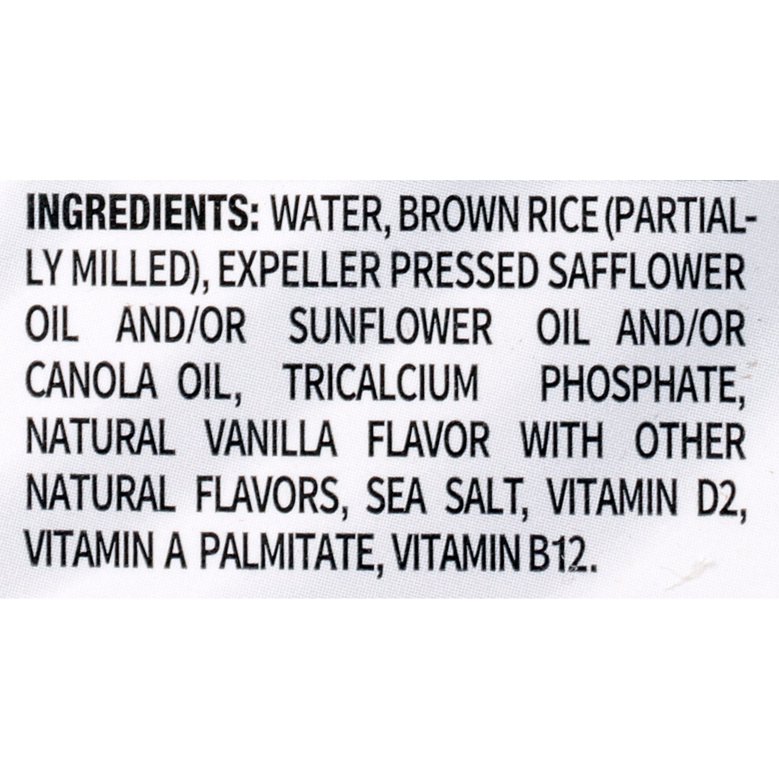 ingredients : ricemilk (water, hydrolyzed rice);canola oil and/or sunflower oil;tricalcium phosphate;natural flavor;sea salt;vitamin a palmitate;vitamin d2 (ergocalciferol);vitamin b12 (cyanocobalamin)