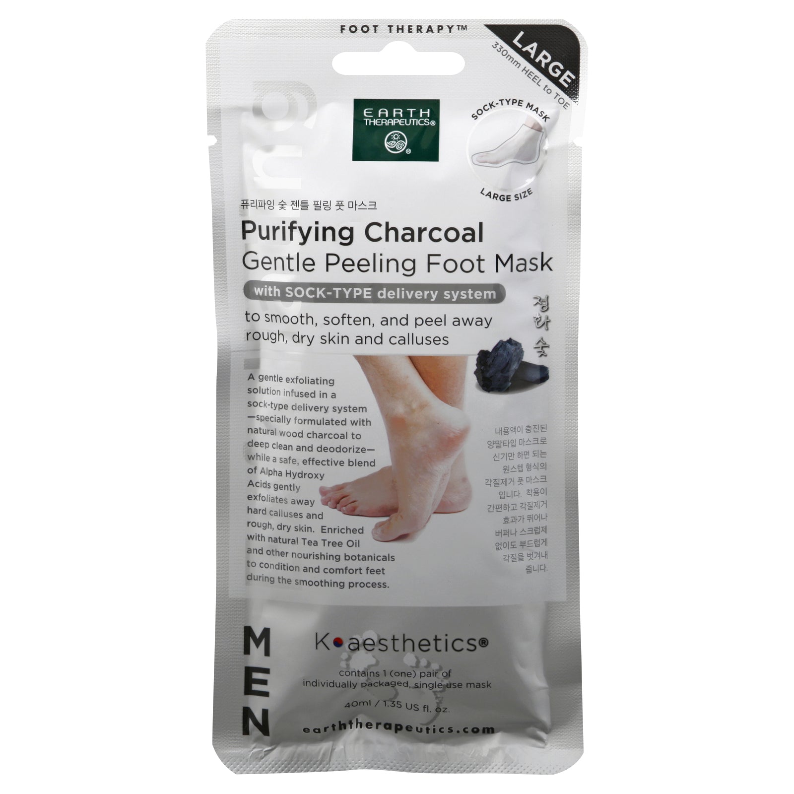 Paraben free. No mineral oil. No lauryl/laureth sulfate. No artificial colors. Men. Foot therapy. Large 330mm heel to toe. With sock-type delivery system. To smooth, soften, and peel away rough, dry skin and calluses. Contains 1 (one) pair of individually packaged single use mask. A gentle exfoliating solution infused in a sock - type delivery system - specially formulated with natural wood charcoal to deep clean and deodorize - while a safe, effective blend of alpha hydroxy acids gently exfoliates away hard calluses and rough, dry skin. Enriched with natural tea tree oil and other nourishing botanicals to condition and comfort feet during the smoothing process. Each treatment gently peels away hard calluses over time and will lead to visibly smooth results within 2 weeks. Sock - type delivery system: protective outer shell is made of recyclable, low density pe. Inner lining (the layer infused with formula) is made of recyclable non-woven, spunlace fabric. Fits most foot sizes: measures 330mm from heel to toe contains one (1) pair of individually packaged, single-use sock-type toot masks. Each individually packaged pair contains 40ml / 1.35 us fl. Oz. Earththerapeutics.com. Cruelty-free. No animal testing. Dispose of properly. Korean beauty. Manufactured in korea. Designed by earth therapeutics.