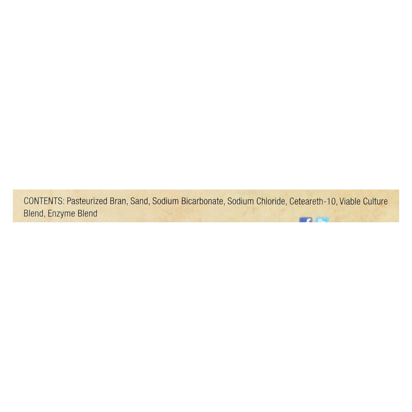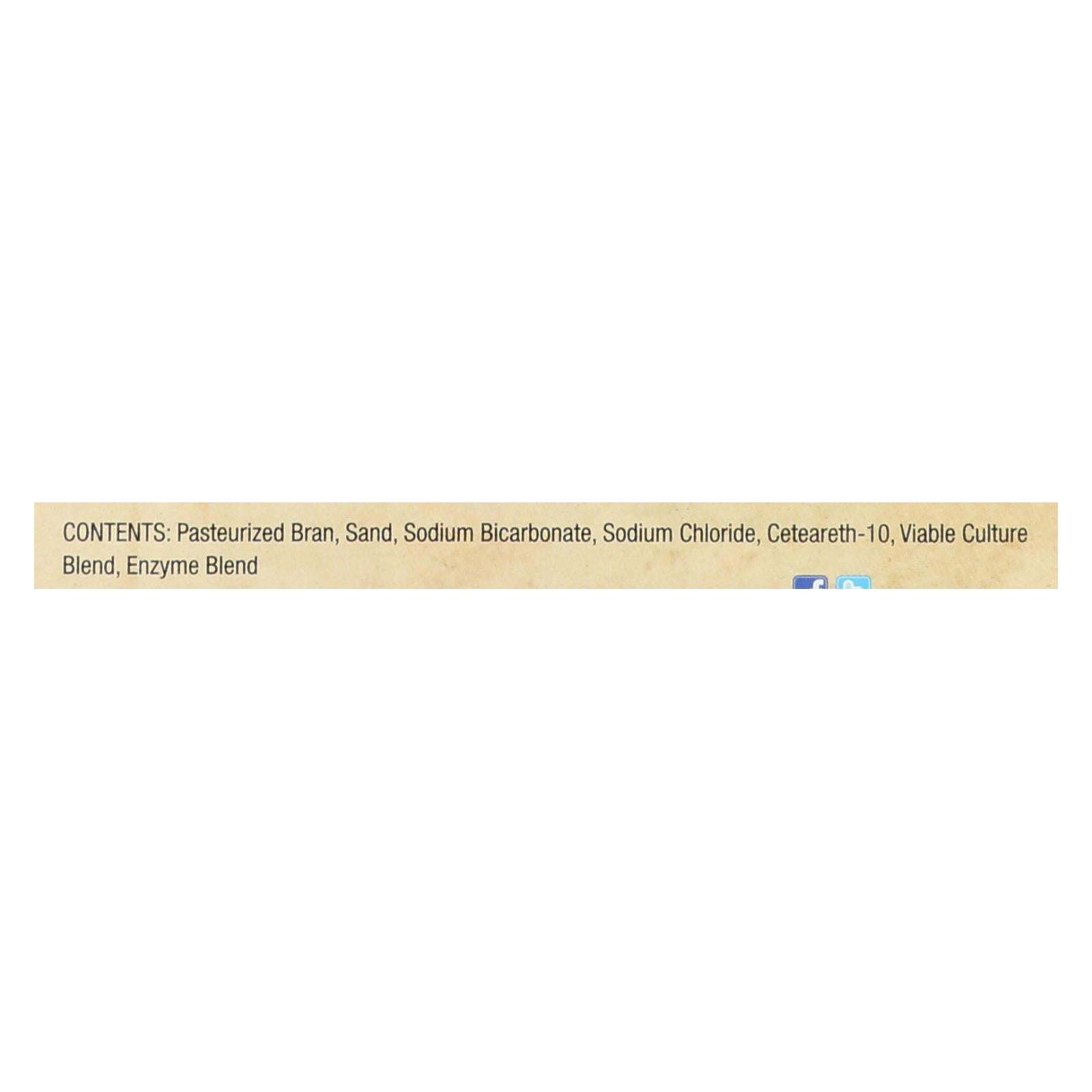 ingredients : contents: pasteurized bran;sand;sodium bicarbonate;sodium chloride;ceteareth-10;viable culture blend;enzyme blend