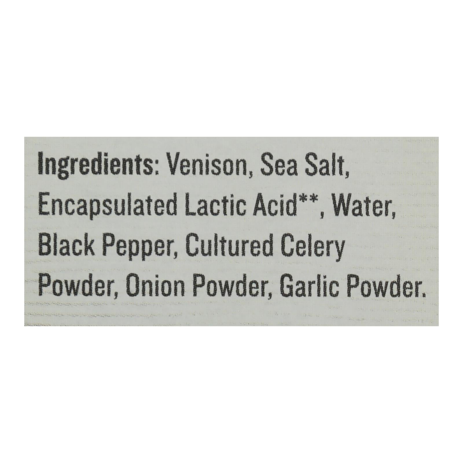 ingredients : venison;sea salt;encapsulated lactic acid;water;black pepper;cultured celery powder;onion powder;garlic powder