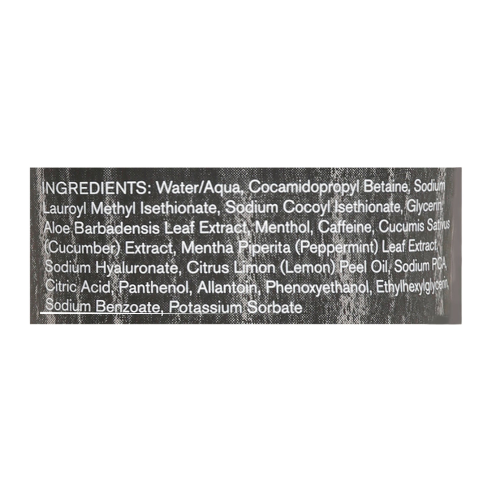 ingredients : water/aqua;cocamidopropyl betaine;sodium lauroyl methyl isethionate;sodium cocoyl isethionate;glycerin;aloe barbadensis leaf extract;menthol;caffeine;cucumis sativus (cucumber) extract;mentha piperita (peppermint) leaf extract;sodium hyaluronate;citrus limon (lemon) peel oil;sodium pca citric acid;panthenol;allantoin;phenoxyethanol;ethylhexylglycerin;sodium benzoate;potassium sorbate