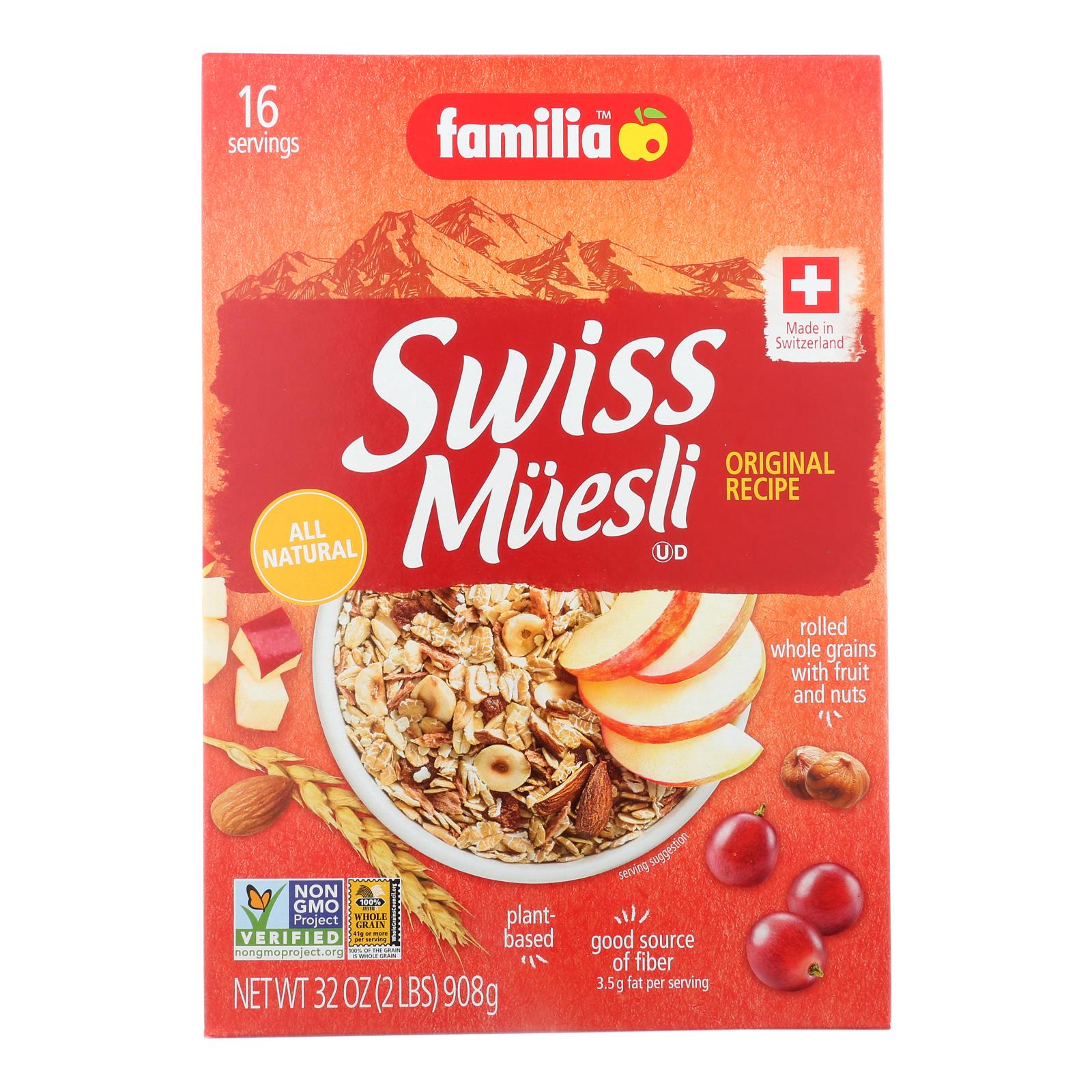 Familia swiss muesli, original recipe is a healthy, natural and delicious breakfast option. Made with natural ingredients, this traditional swiss cereal is free of unnatural and unnecessary additives. This product is kosher and non-gmo. Each box of familia swiss muesli, original recipe contains 32 oz. Of cereal. This cereal is a product of switzerland.