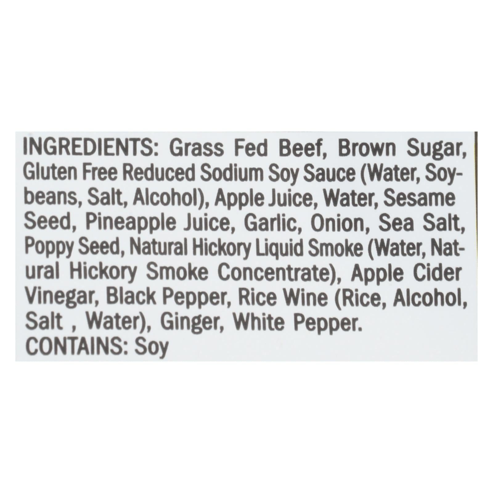 ingredients : grass fed beef;brown sugar;gluten free reduced sodium soy sauce;water;soy-beans;salt;alcohol;apple juice;sesame seed;pineapple juice;garlic;onion;sea salt;poppy seed;natural hickory liquid smoke;natural hickory smoke concentrate;apple cider vinegar;black pepper;rice wine;rice;ginger;white pepper