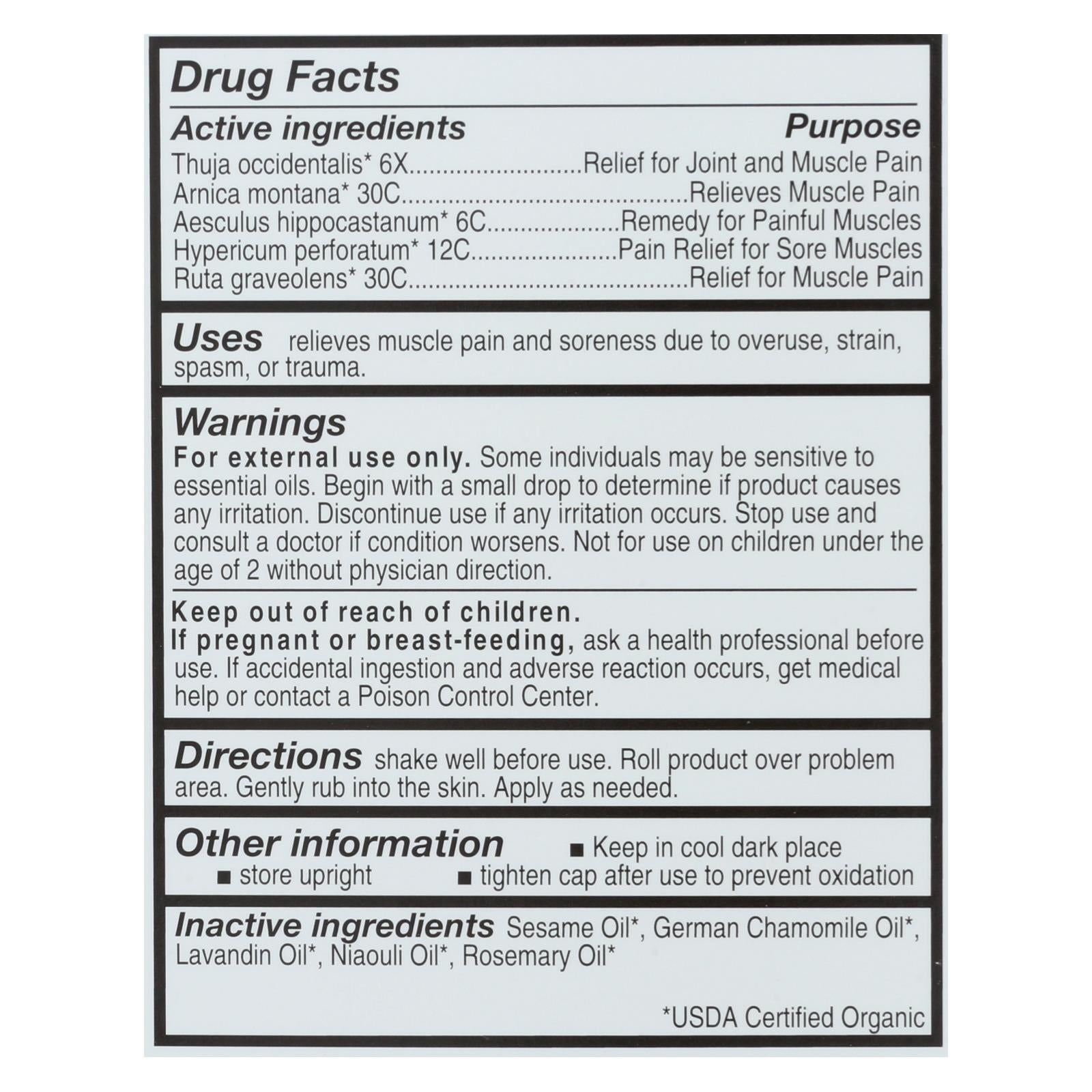 ingredients : sesame oil;german chamomile oil;lavandin oil;niaouli oil;rosemary oil;thuja occidentalis* 6x purpose relief for joint and muscle pain arnica montana* 30c purpose relieves muscle pain aesculus hippocastanum* 6c purpose remedy for painful muscles hypericum perforatum* 12c purpose pain relief for sore muscles ruta graveolens* 30c purpose relief for muscle pain