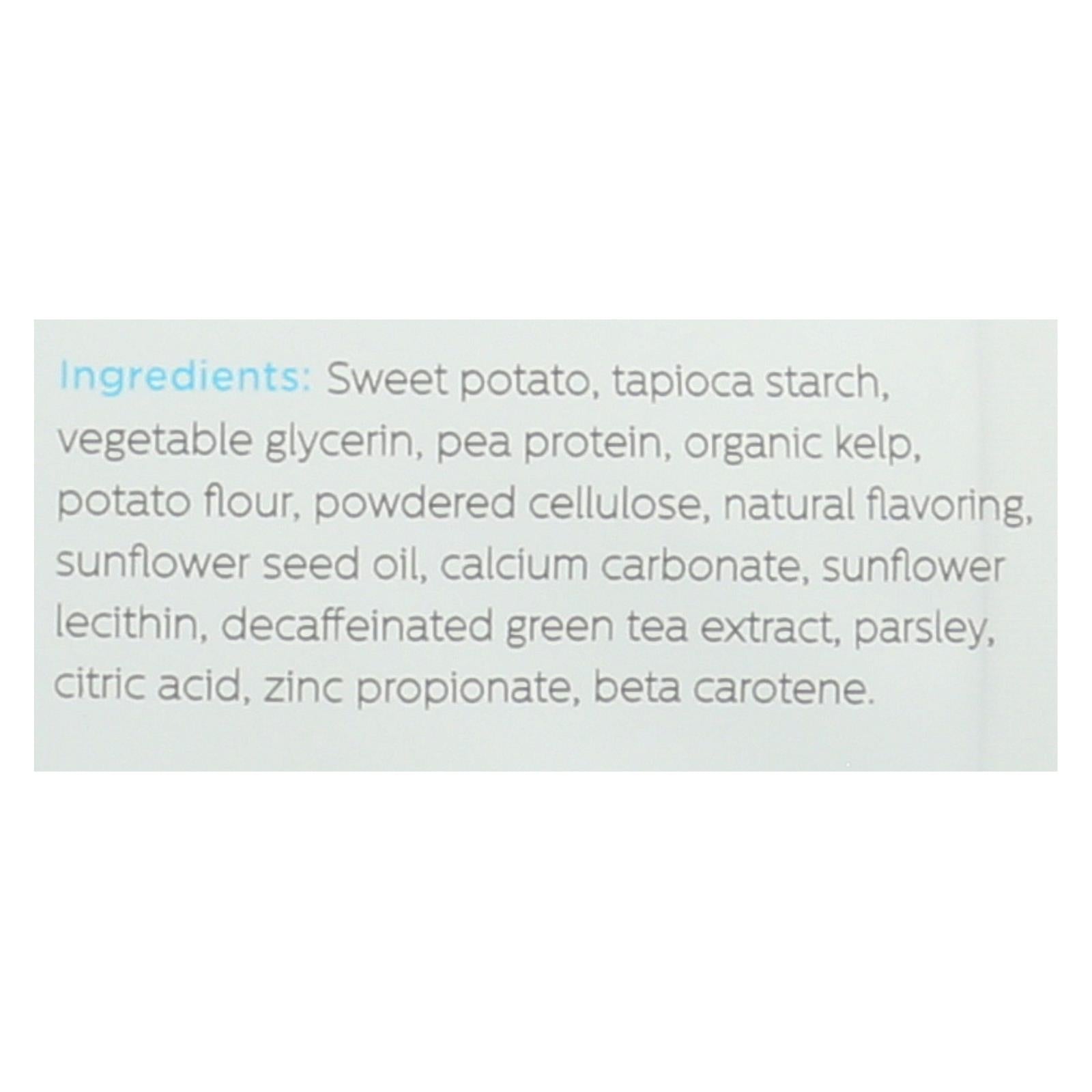 ingredients : sweet potato;tapioca starch;vegetable glycerin;pea protein;organic kelp;potato flour;powdered cellulose;natural flavoring;sunflower seed oil;calcium carbonate;sunflower lecithin;decaffeinated green tea extract;parsley;citric acid;zinc propionate;beta carotene