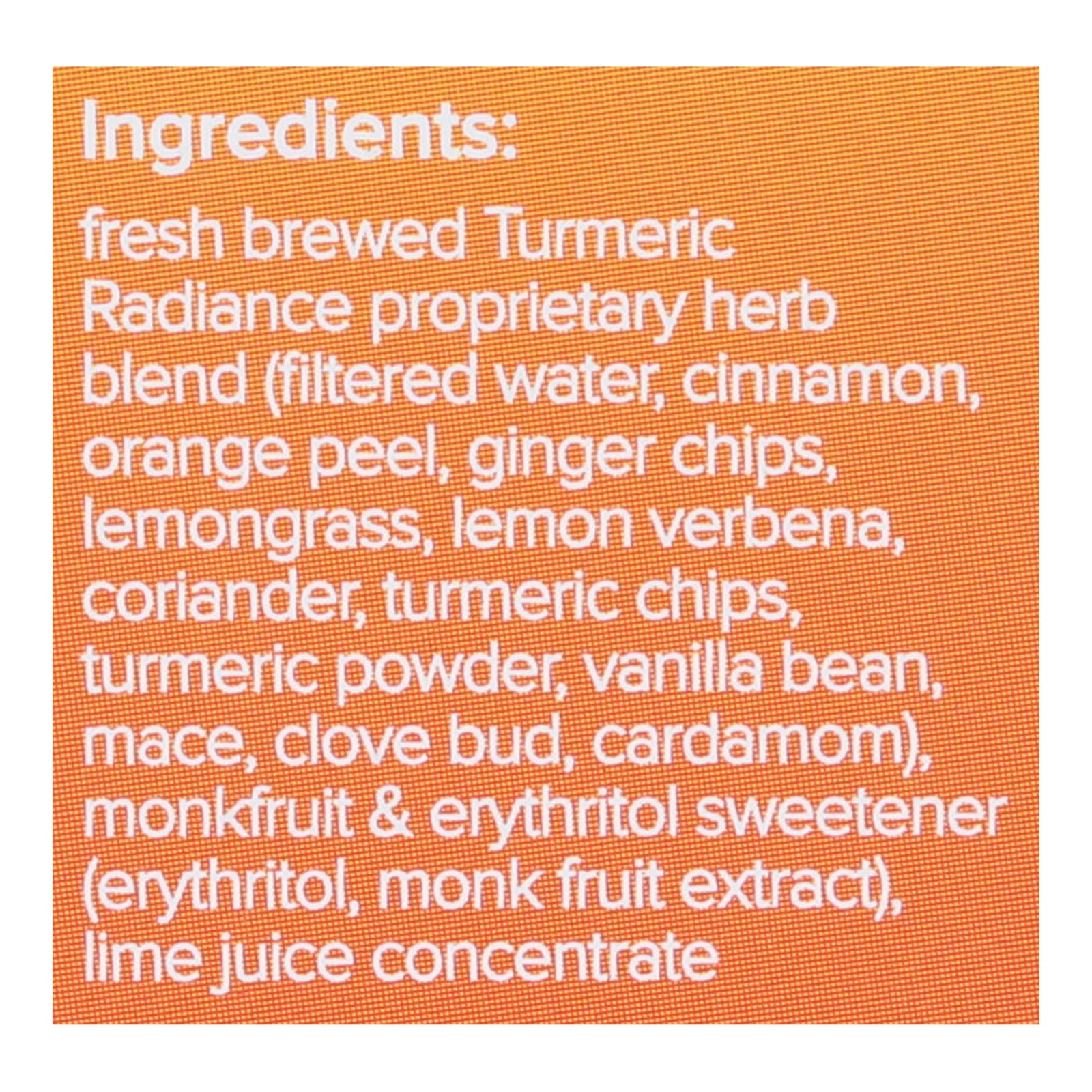 ingredients : water (reverse osmosis);lime juice concentrate;turmeric radiance proprietary herb bend (ginger, cinnamon, lemon verbena, lemongrass, orange peel, coriander, turmeric chips, turmeric powder, mace, cardamom, cloves, vanilla bean);monk fruit extract;naturally occurring erythritol